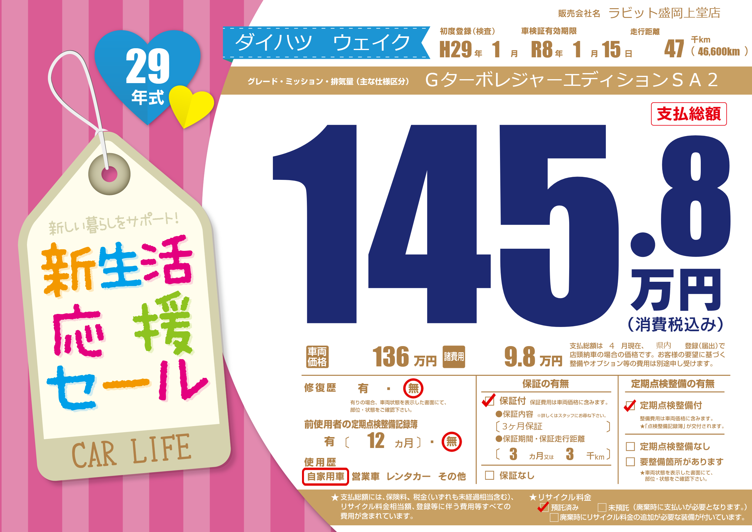 | 走行キロ | 4.7万km | 初年度登録 | H29年1月 |