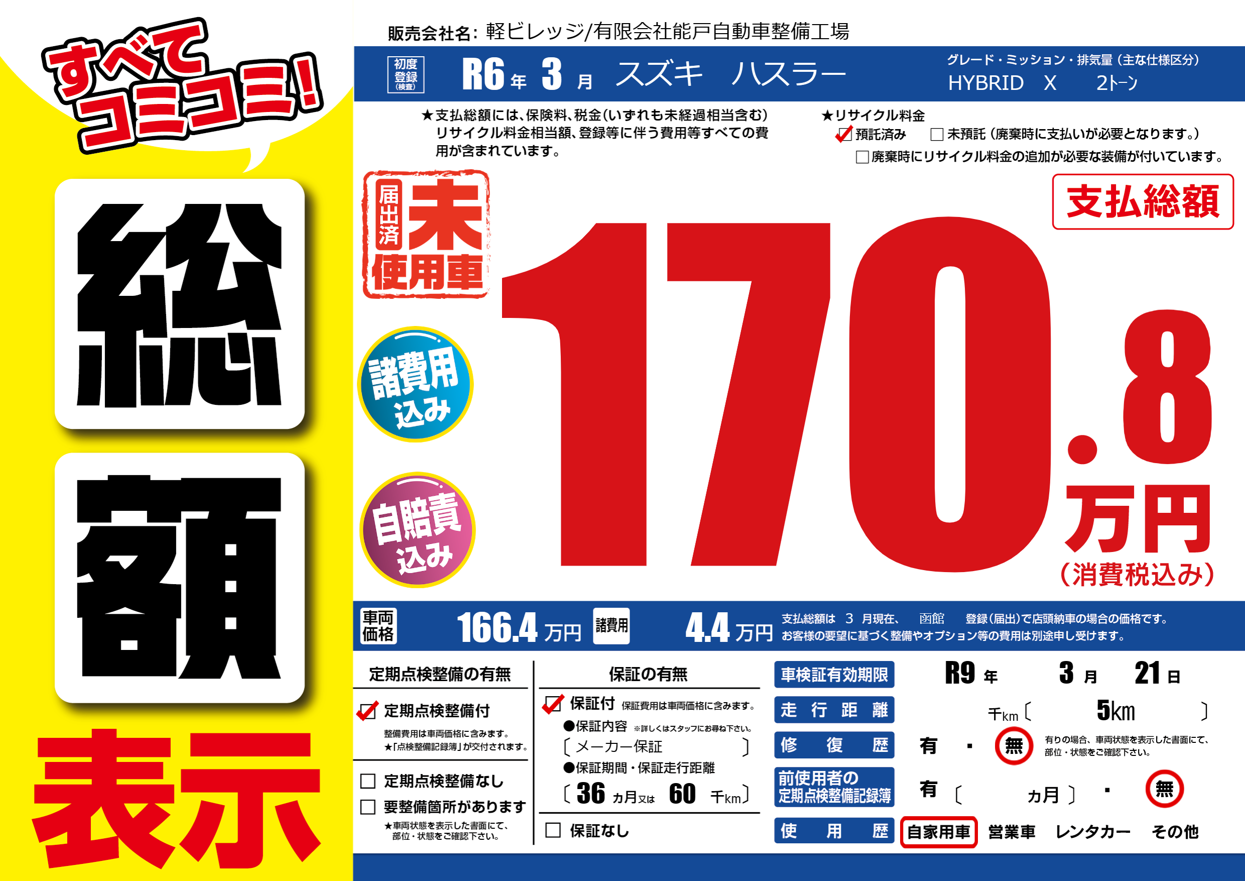 | 車名 | スズキ ハスラー | グレード ミッション 排気量 |