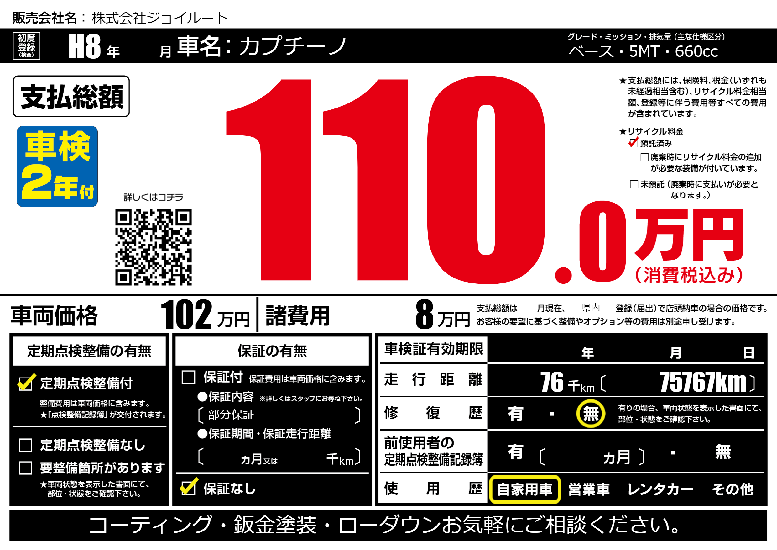 | 走行キロ | 7.6万km | 初年度登録 | H8年---月 |
