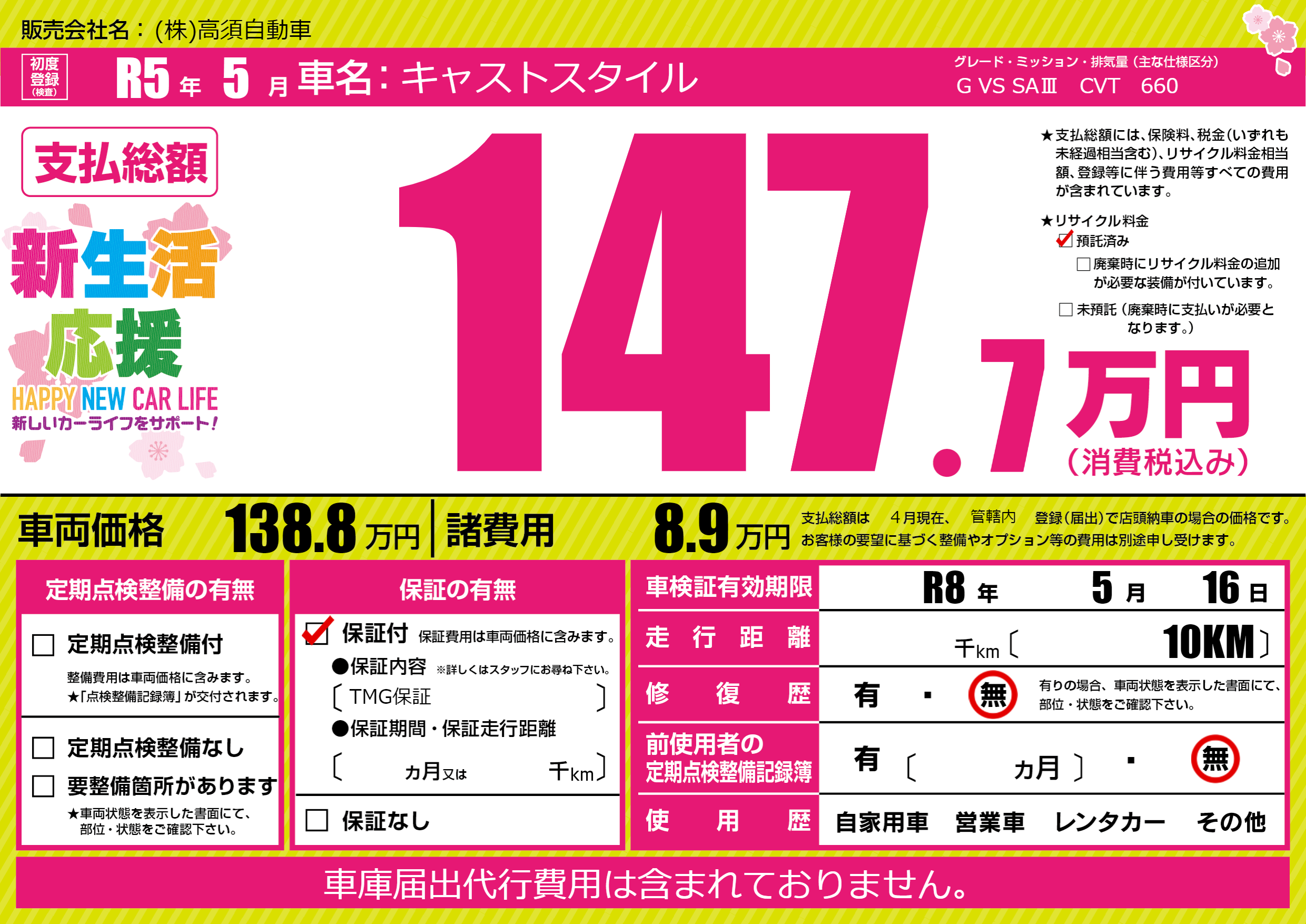 あり | リサイクル預託金相当額 | ( 0円)が別途必要 |