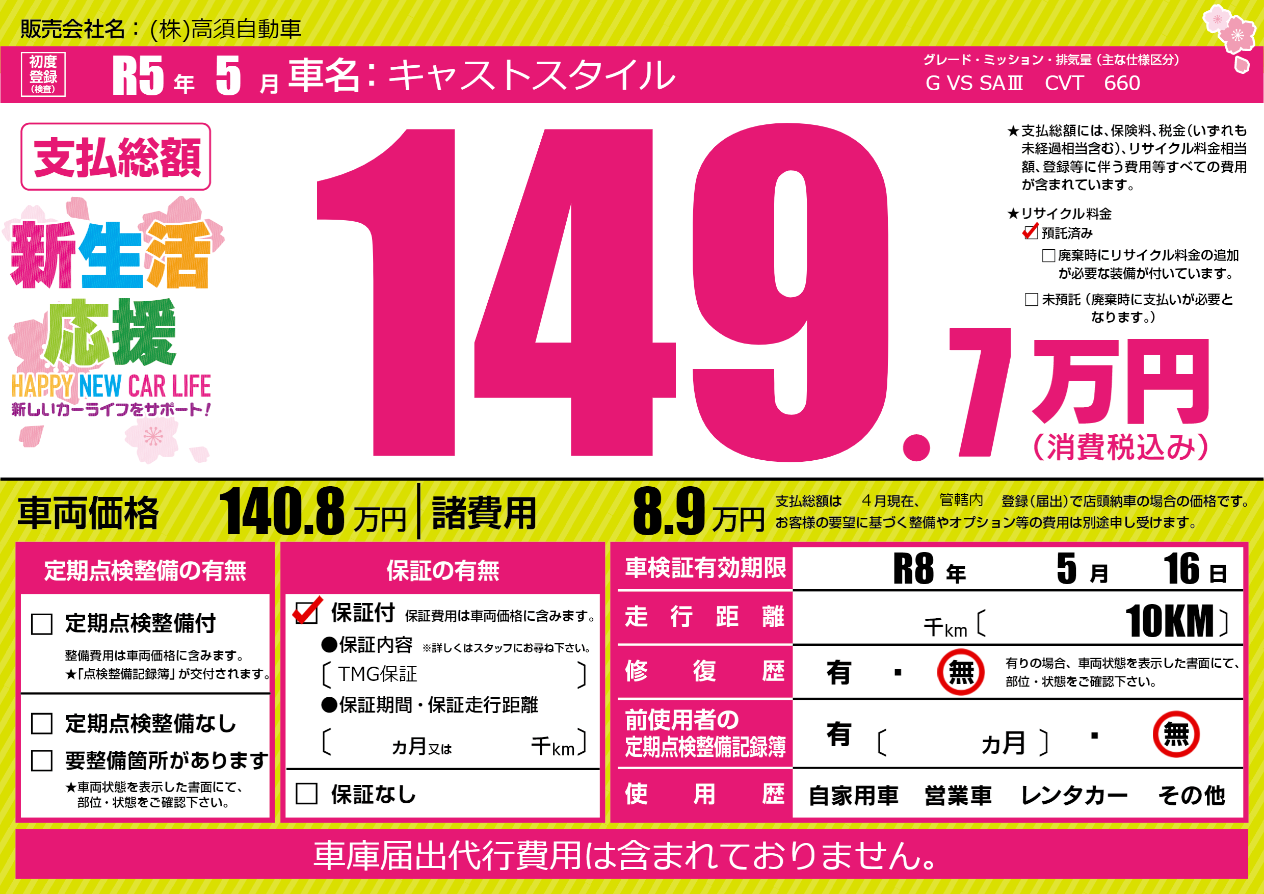 保証付き 保証内容(TMG保証) ---ヶ月または()千kmまで |