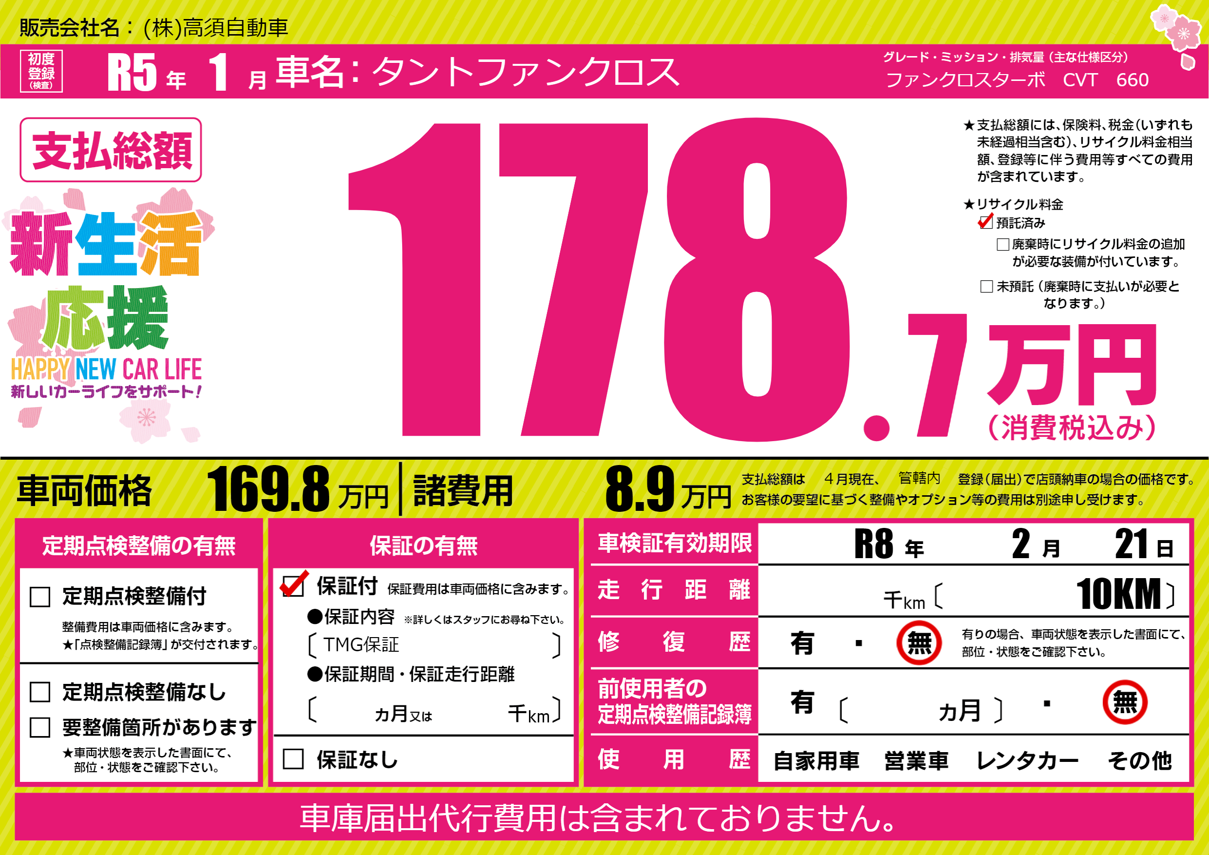 保証付き 保証内容(TMG保証) ---ヶ月または()千kmまで |