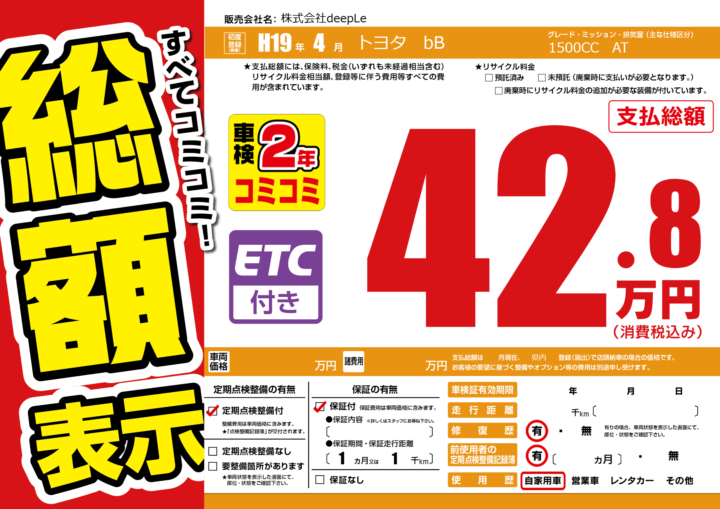 | 車名 | トヨタ bB | グレード ミッション 排気量 |