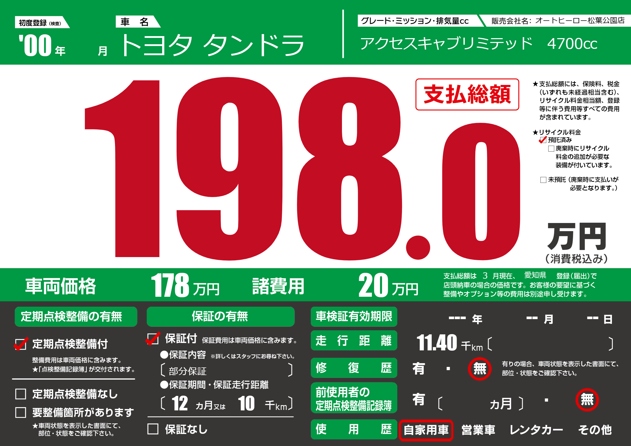 | 車名 | トヨタ タンドラ | グレード ミッション 排気量 |