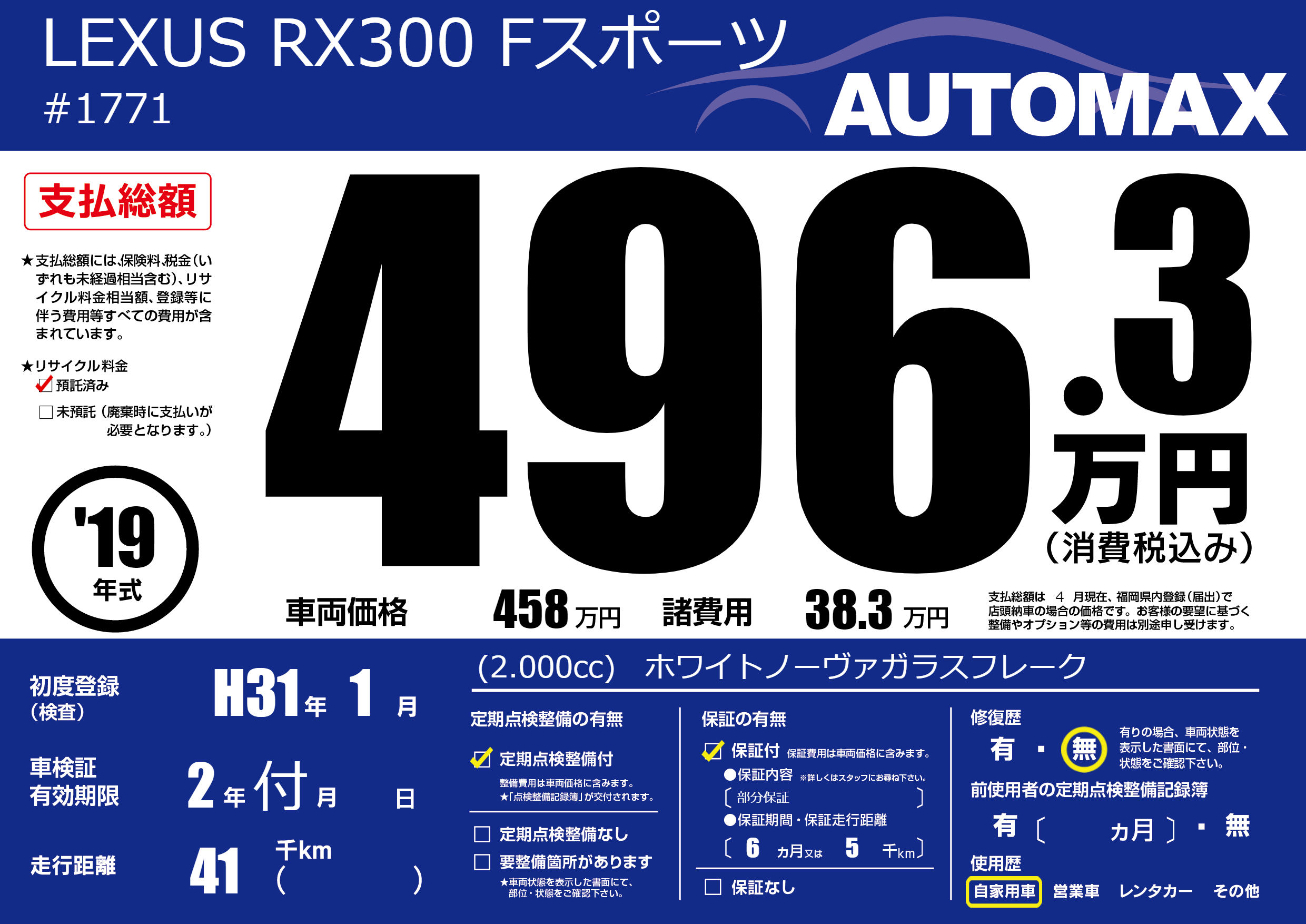 | 車名 | LEXUS RX300 Fスポーツ | グレード ミッション 排気量 |