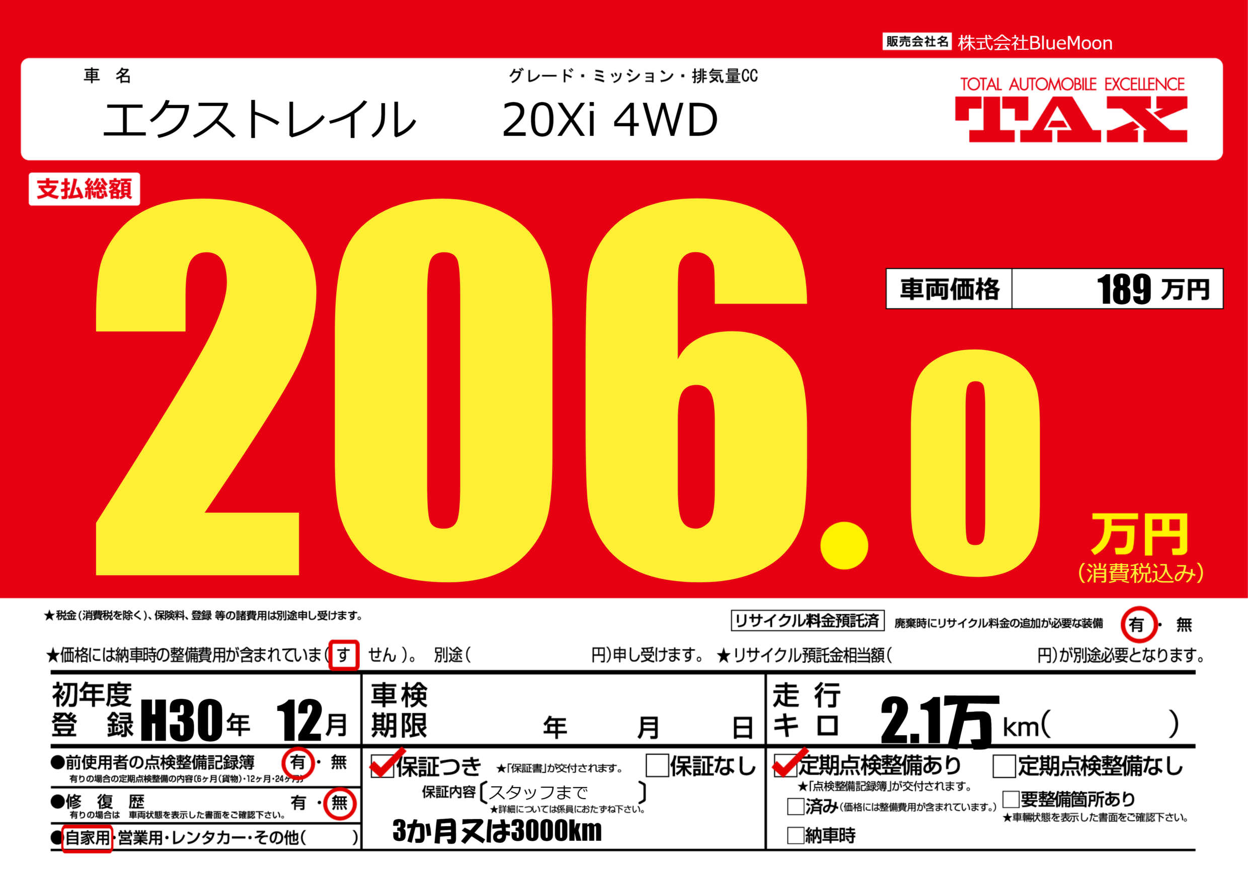 保証付き 保証内容(スタッフまで) ---ヶ月または()千kmまで |