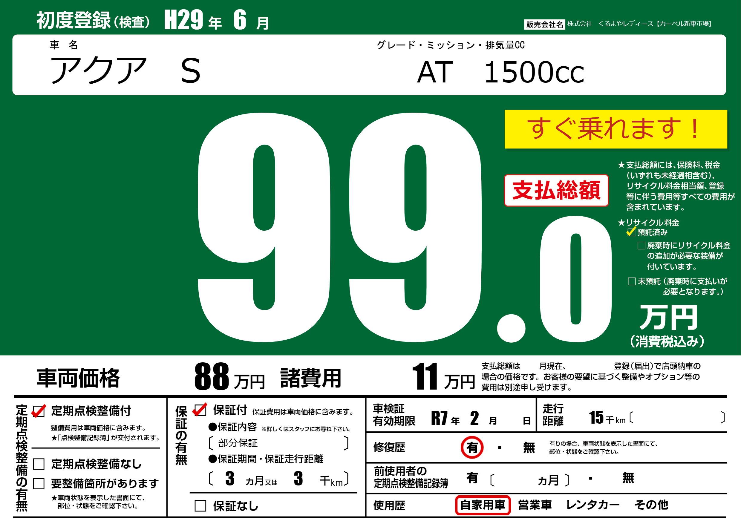 | 車名 | アクア S | グレード ミッション 排気量 |
