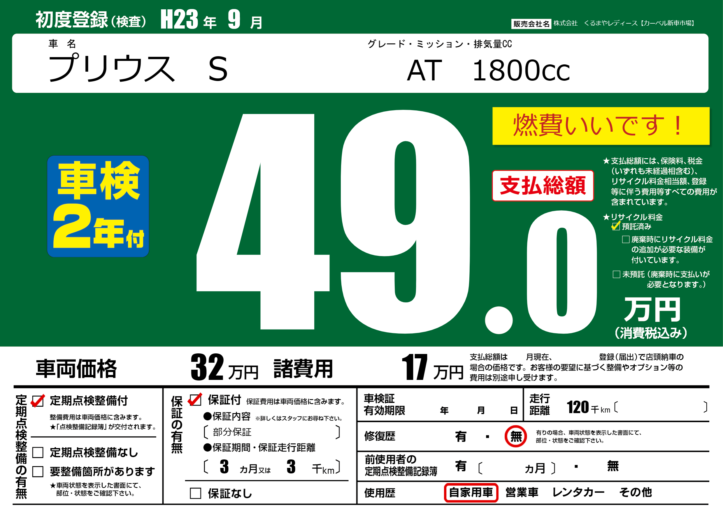 | 走行キロ | 12万km | 初年度登録 | H23年9月 |