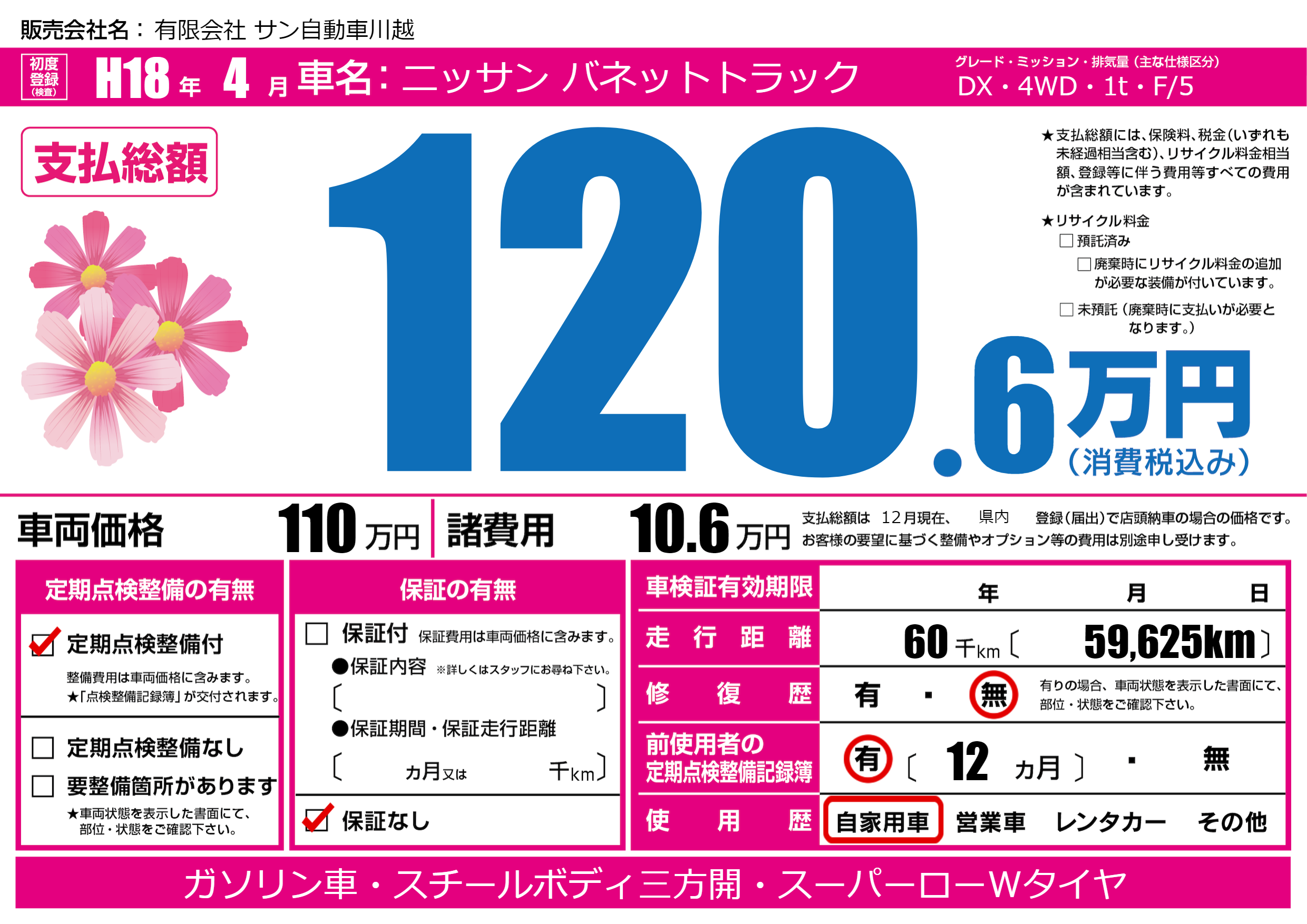 | 車名 | ニッサン バネットトラック | グレード ミッション 排気量 |