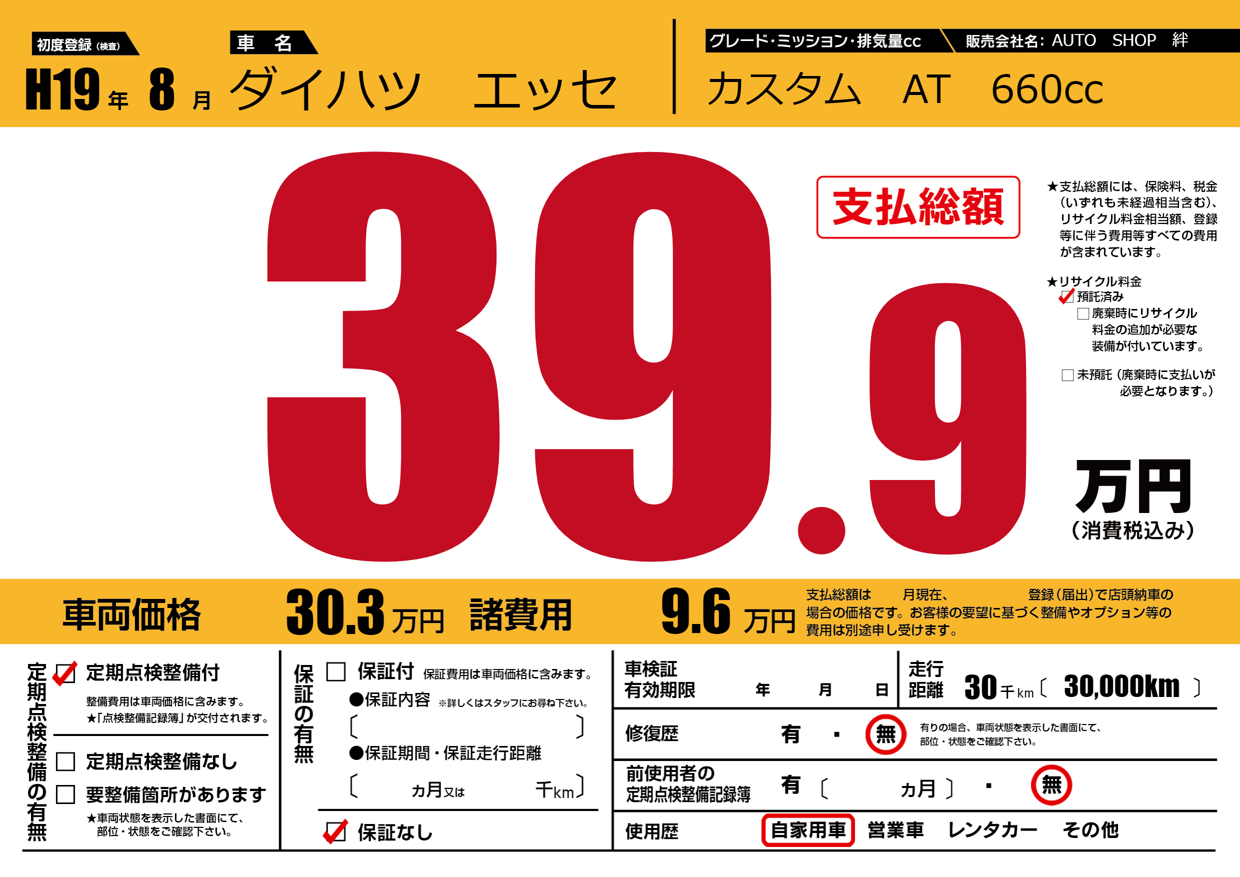 | 車名 | ダイハツ エッセ | グレード ミッション 排気量 |