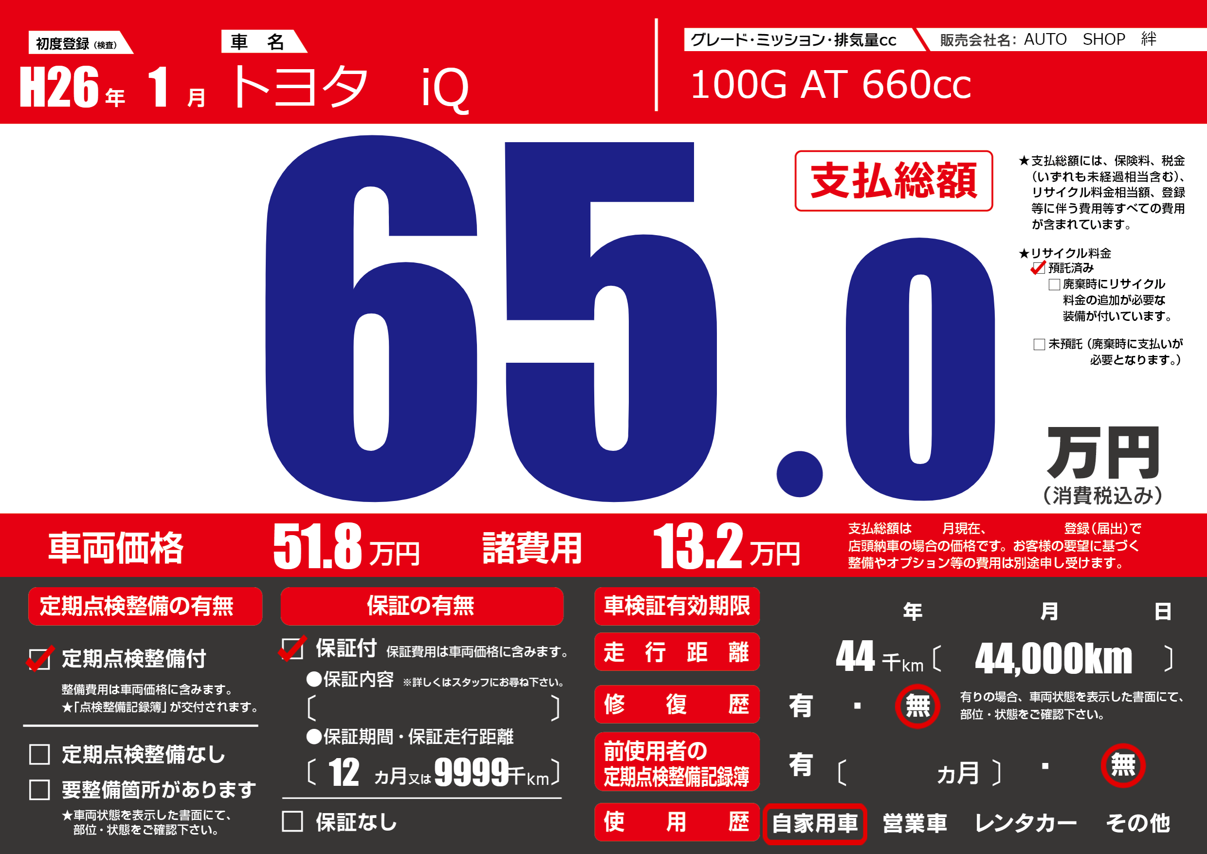 保証付き 保証内容(---) 12ヶ月または(9999)千kmまで |