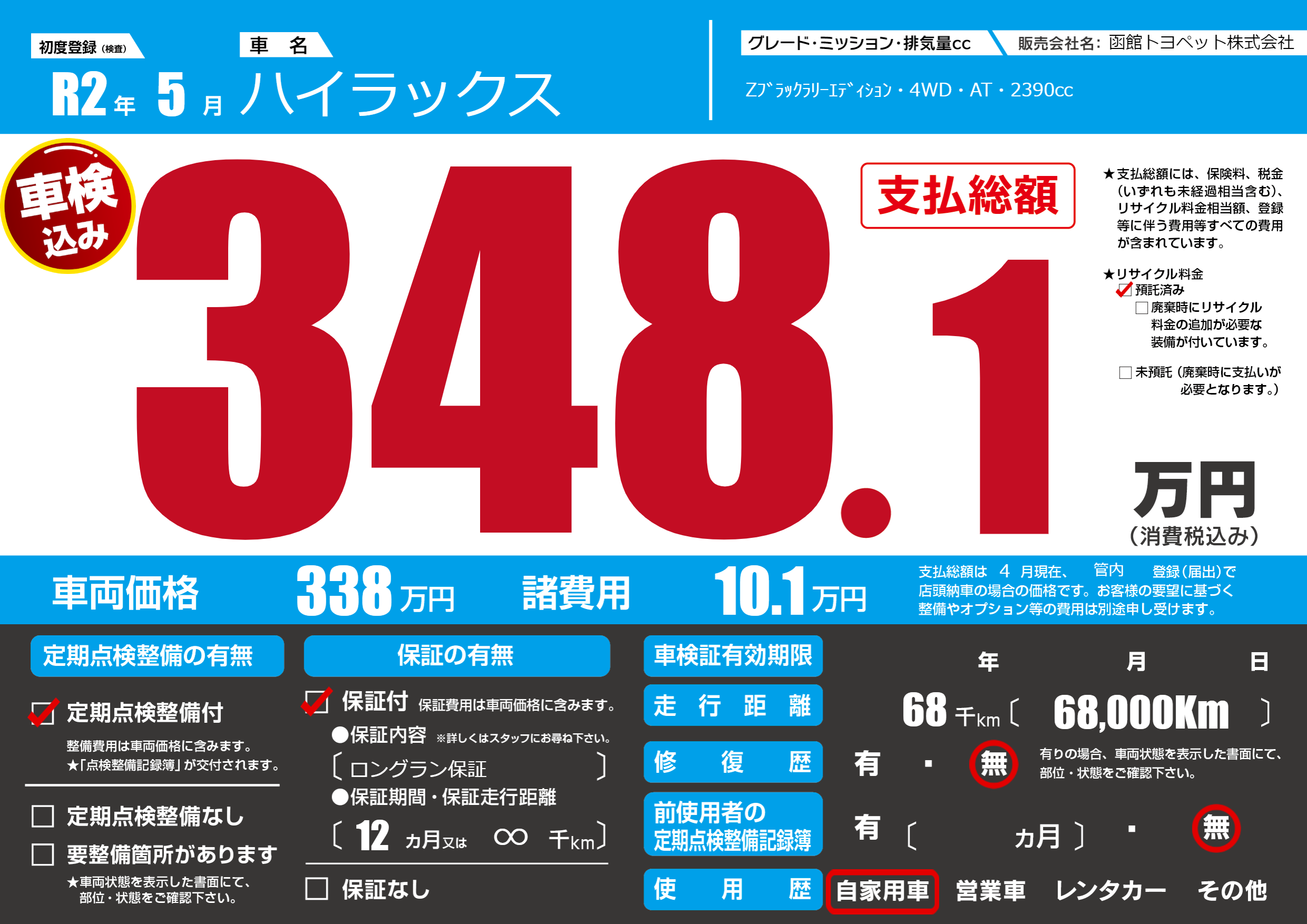 | 走行キロ | 6.8万km | 初年度登録 | R2年5月 |