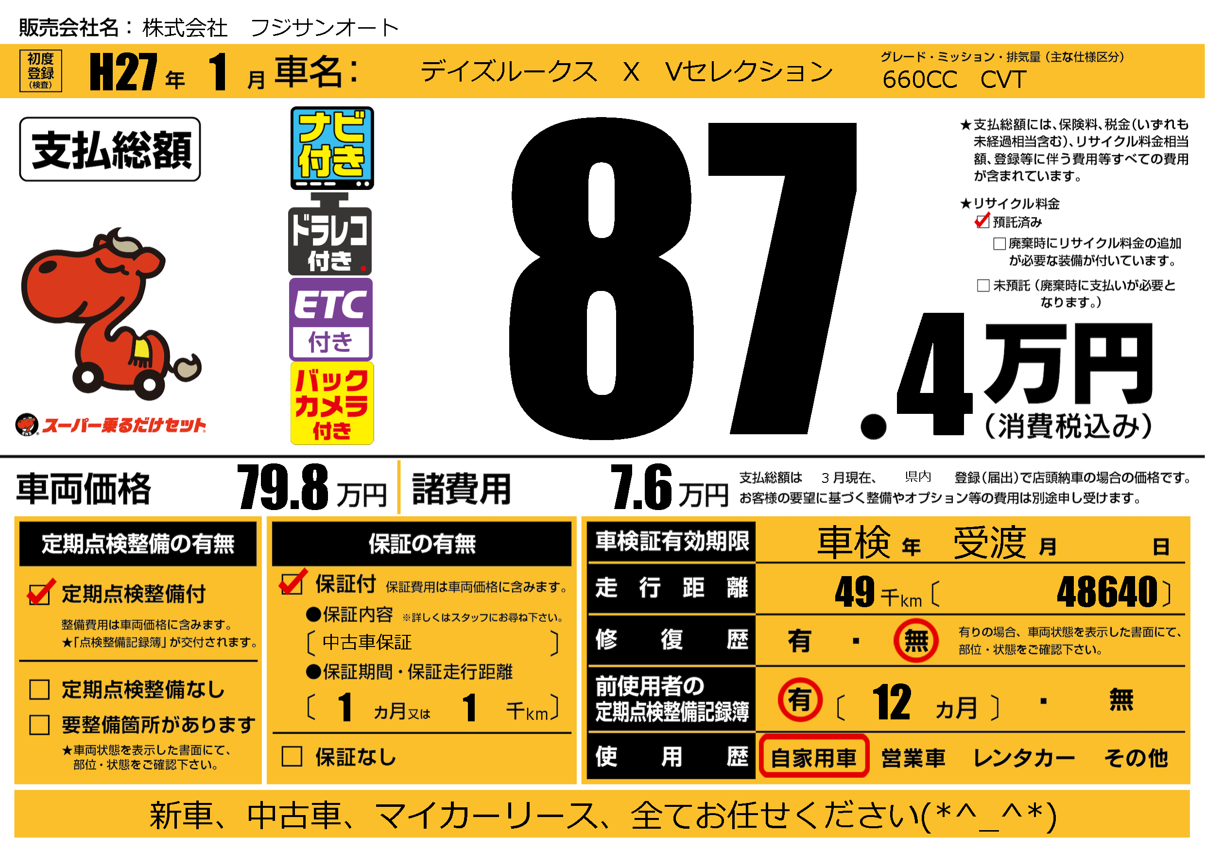 | 走行キロ | 4.9万km | 初年度登録 | H27年1月 |