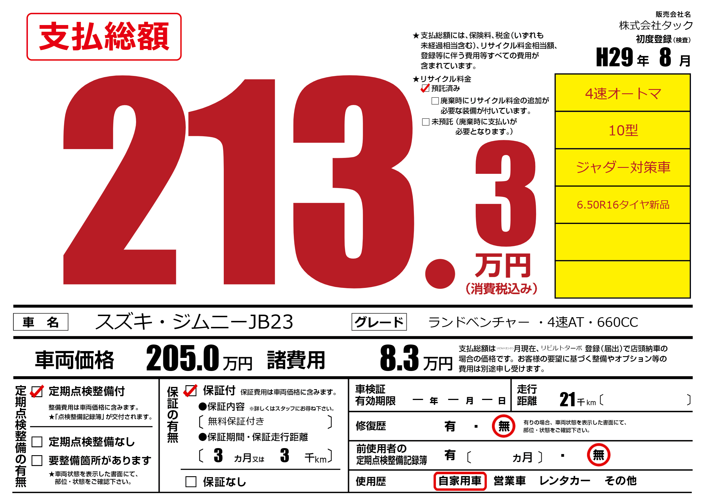 | 車名 | スズキ・ジムニーJB23 | グレード ミッション 排気量 |
