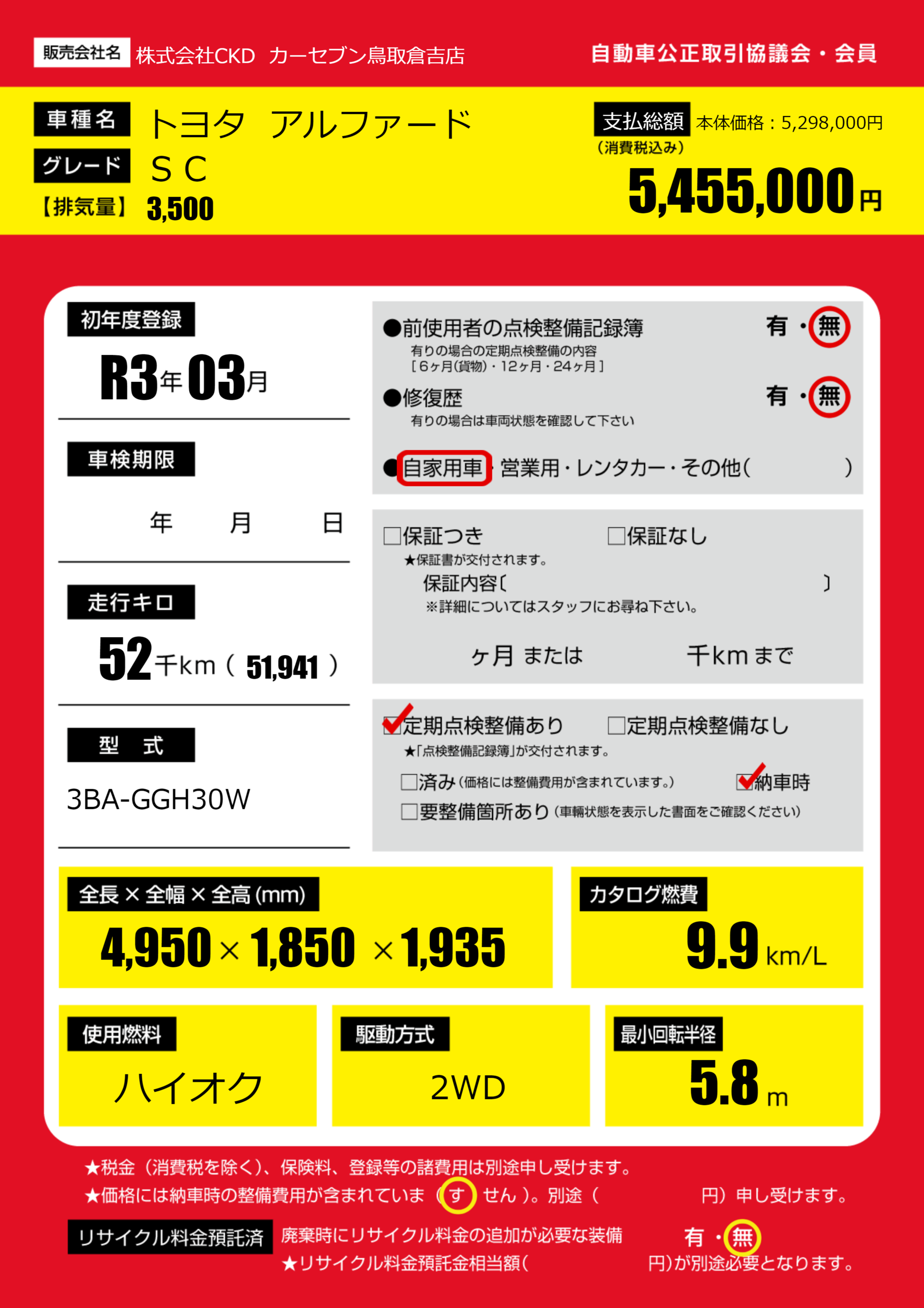 | 車名 | トヨタ アルファード | グレード ミッション 排気量 |
