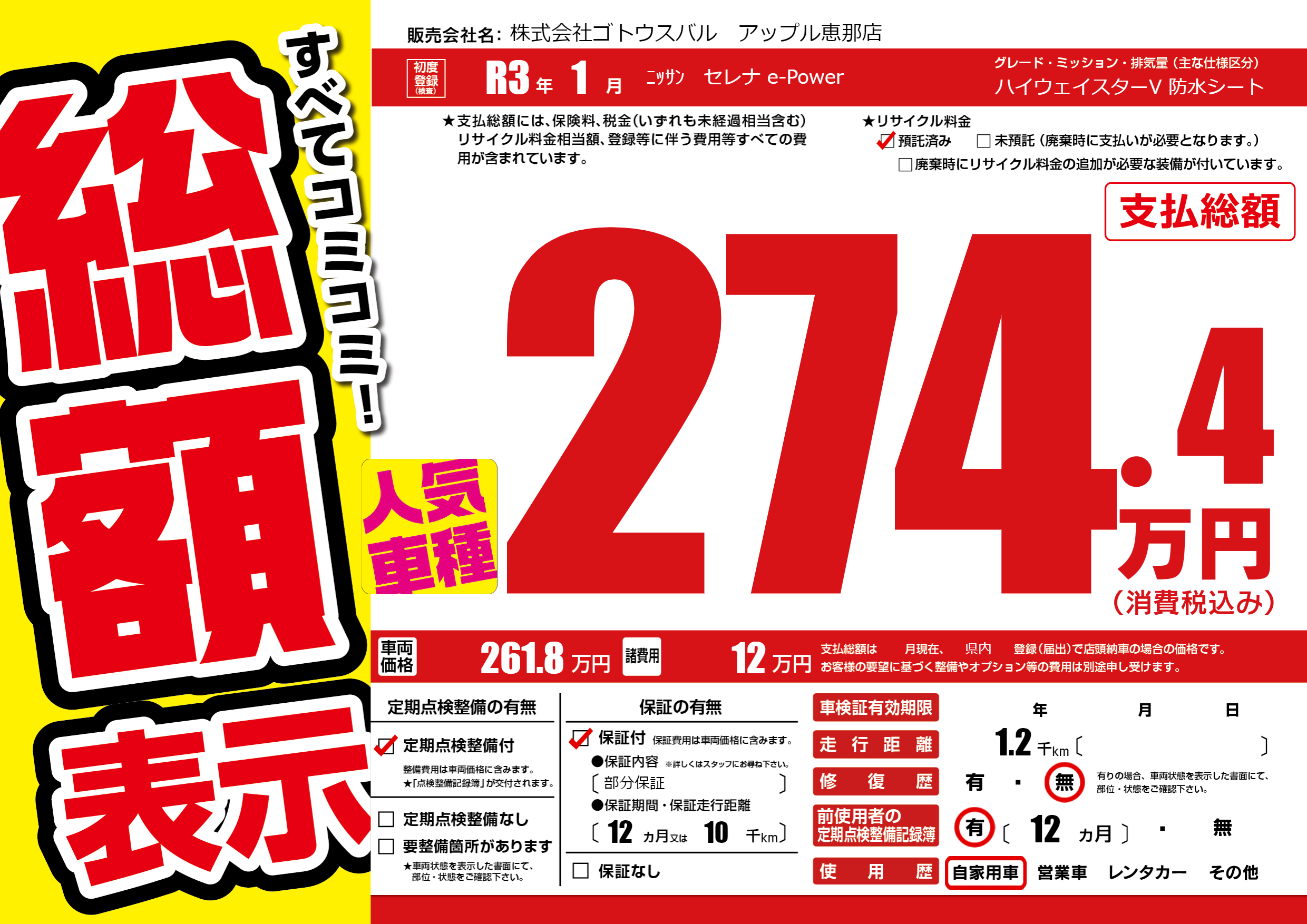 保証付き 保証内容(部分保証) 12ヶ月または(10)千kmまで |