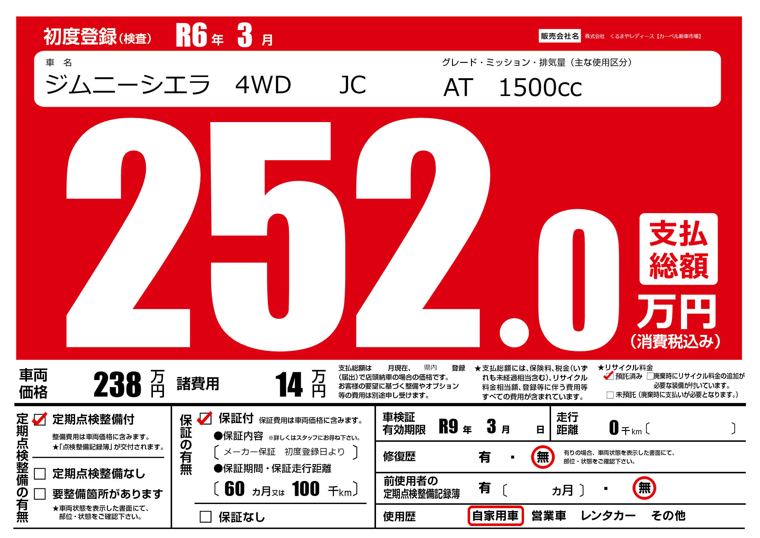| 車名 | ジムニーシエラ 4WD JC | グレード ミッション 排気量 |