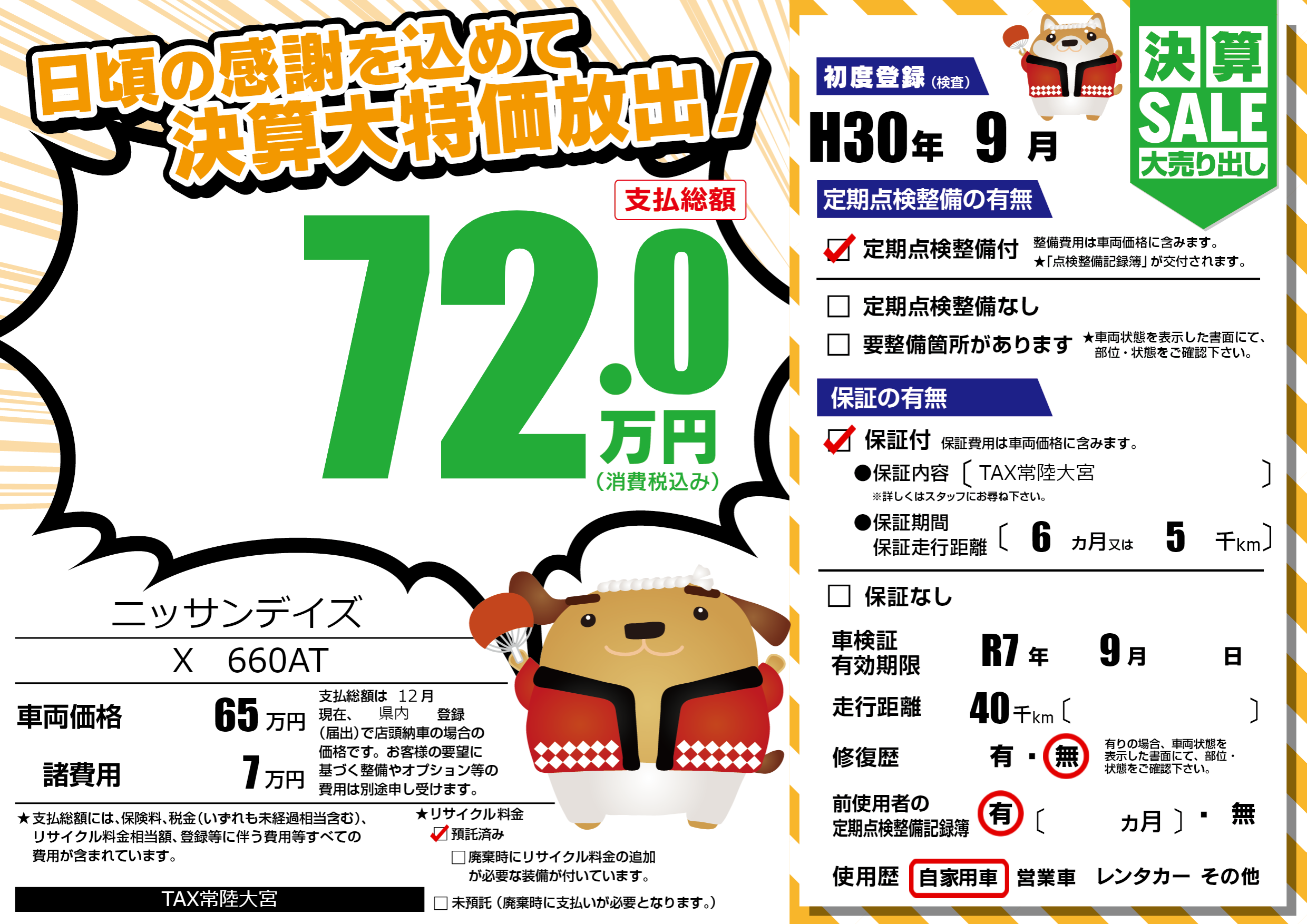保証付き 保証内容(TAX常陸大宮) 6ヶ月または(5)千kmまで |