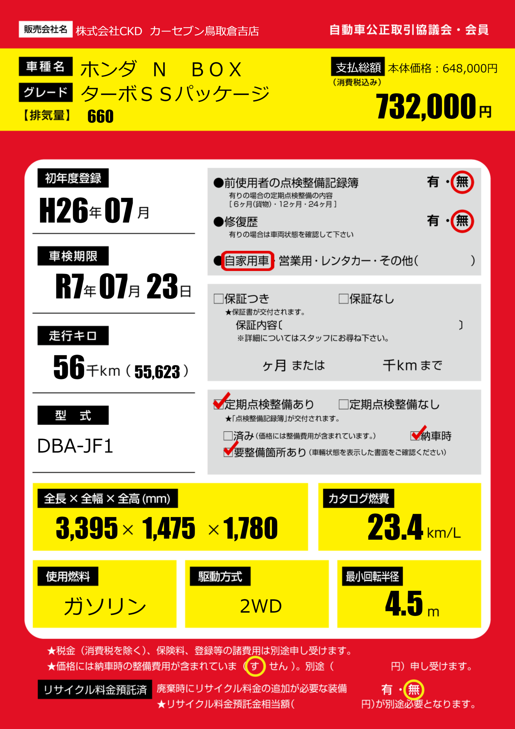 | 車名 | ホンダ N BOX | グレード ミッション 排気量 |
