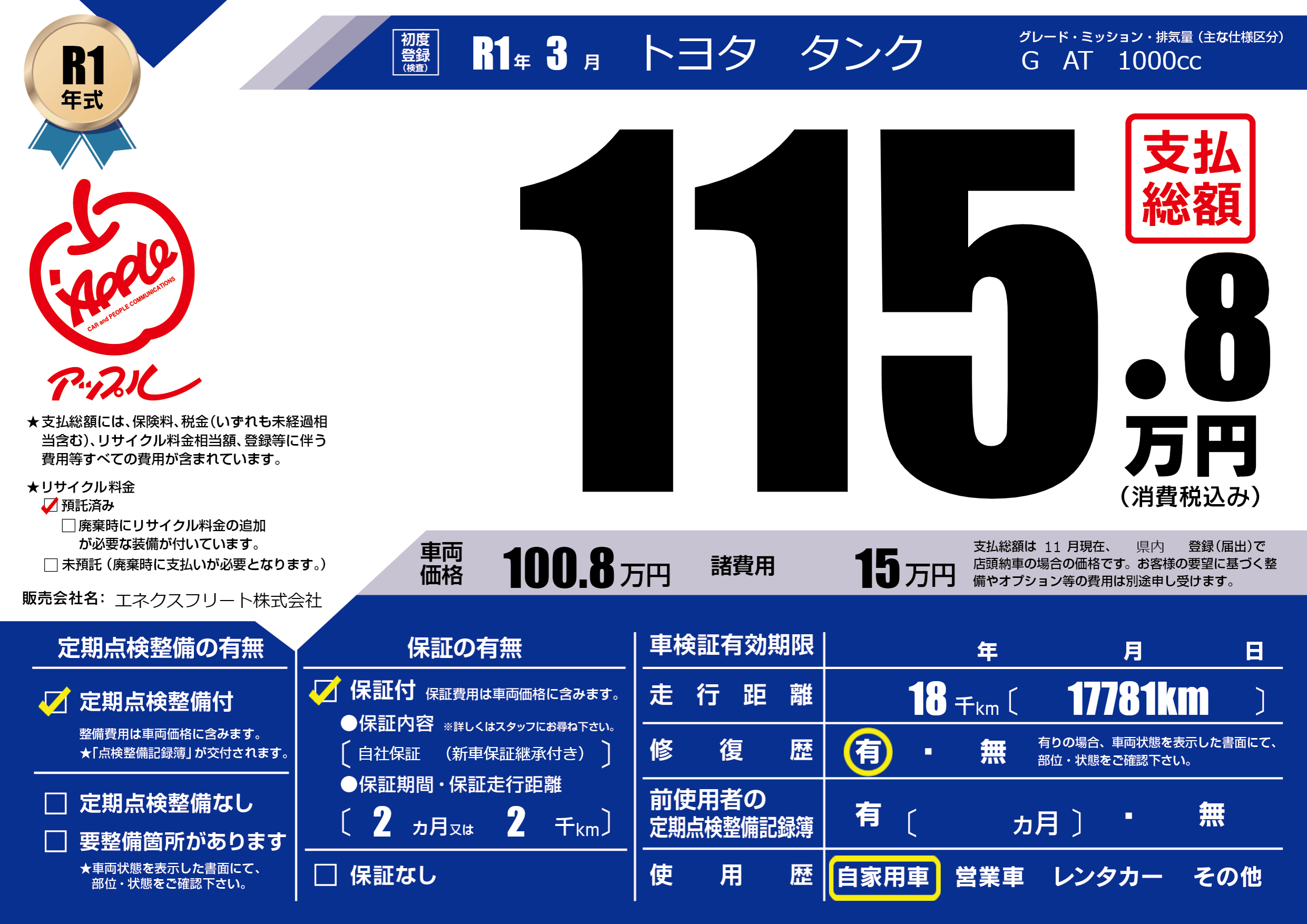 | 車名 | トヨタ タンク | グレード ミッション 排気量 |