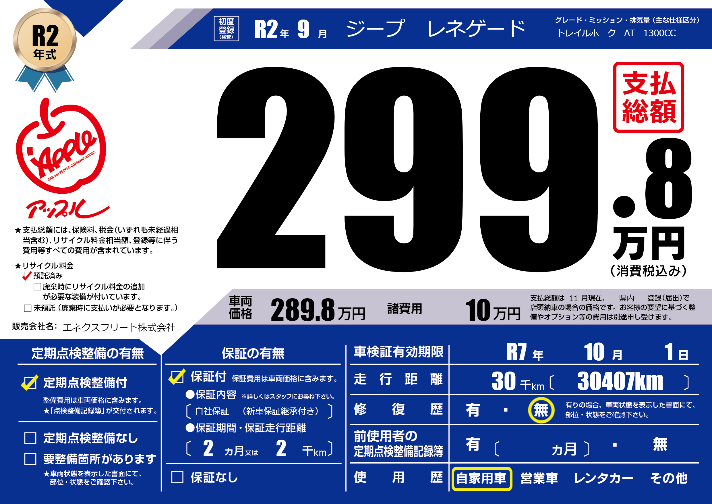| 走行キロ | 3万km | 初年度登録 | R2年9月 |