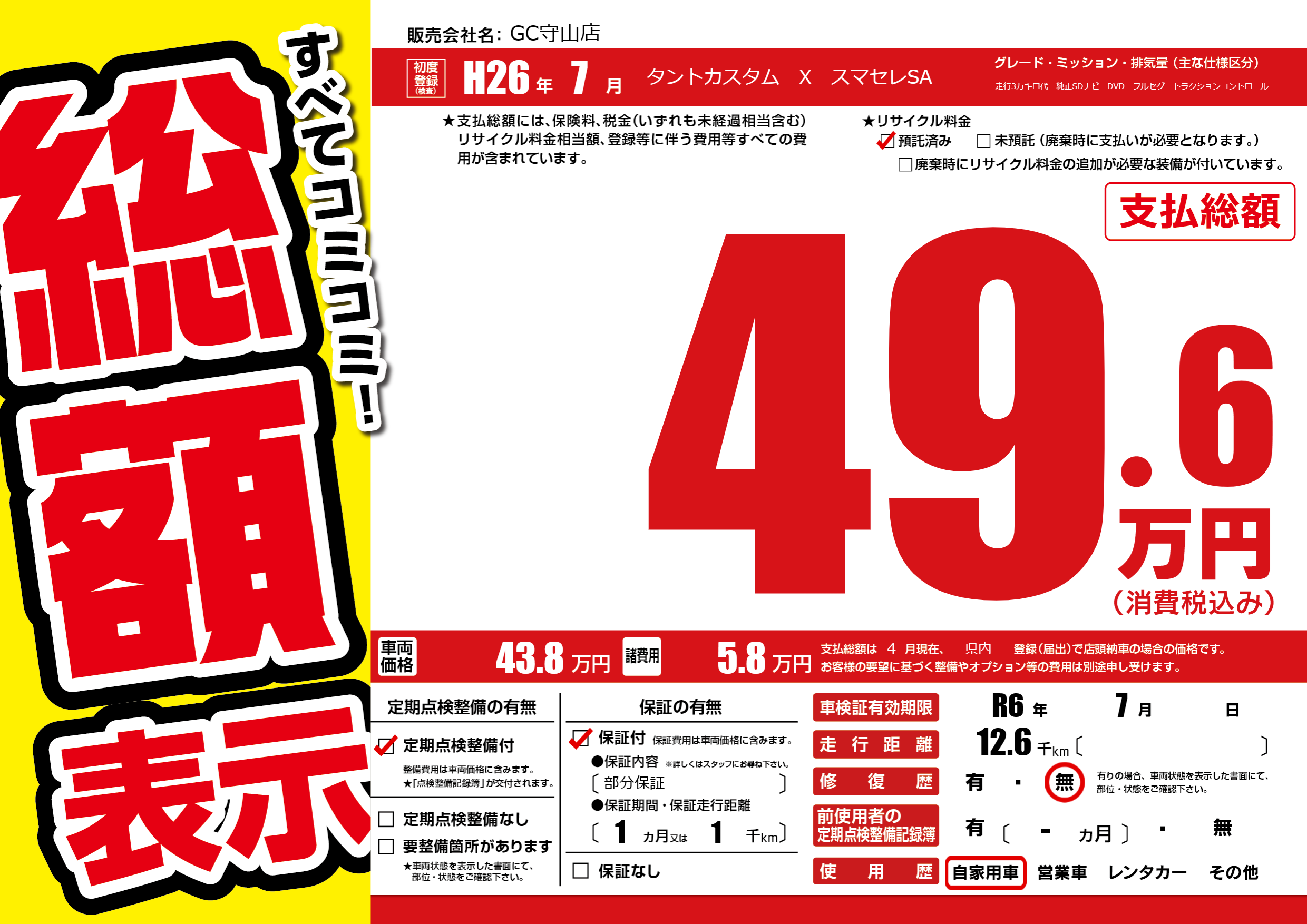 | 車名 | タントカスタム X スマセレSA | グレード ミッション 排気量 |