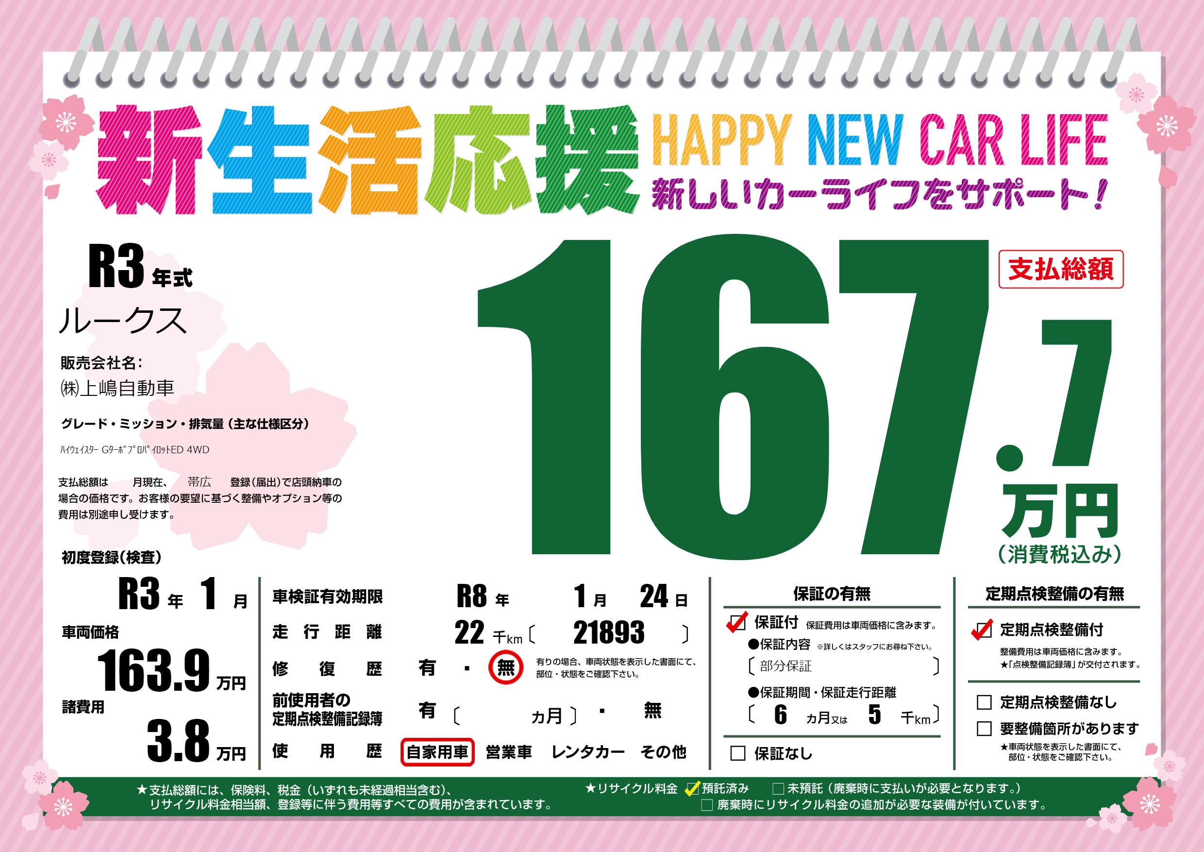 | 走行キロ | 2.2万km | 初年度登録 | R3年1月 |