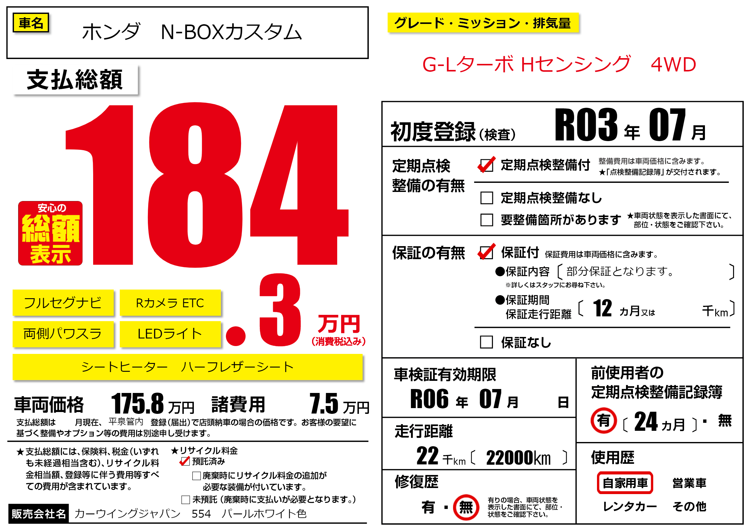 | 車名 | ホンダ N-BOXカスタム | グレード ミッション 排気量 |
