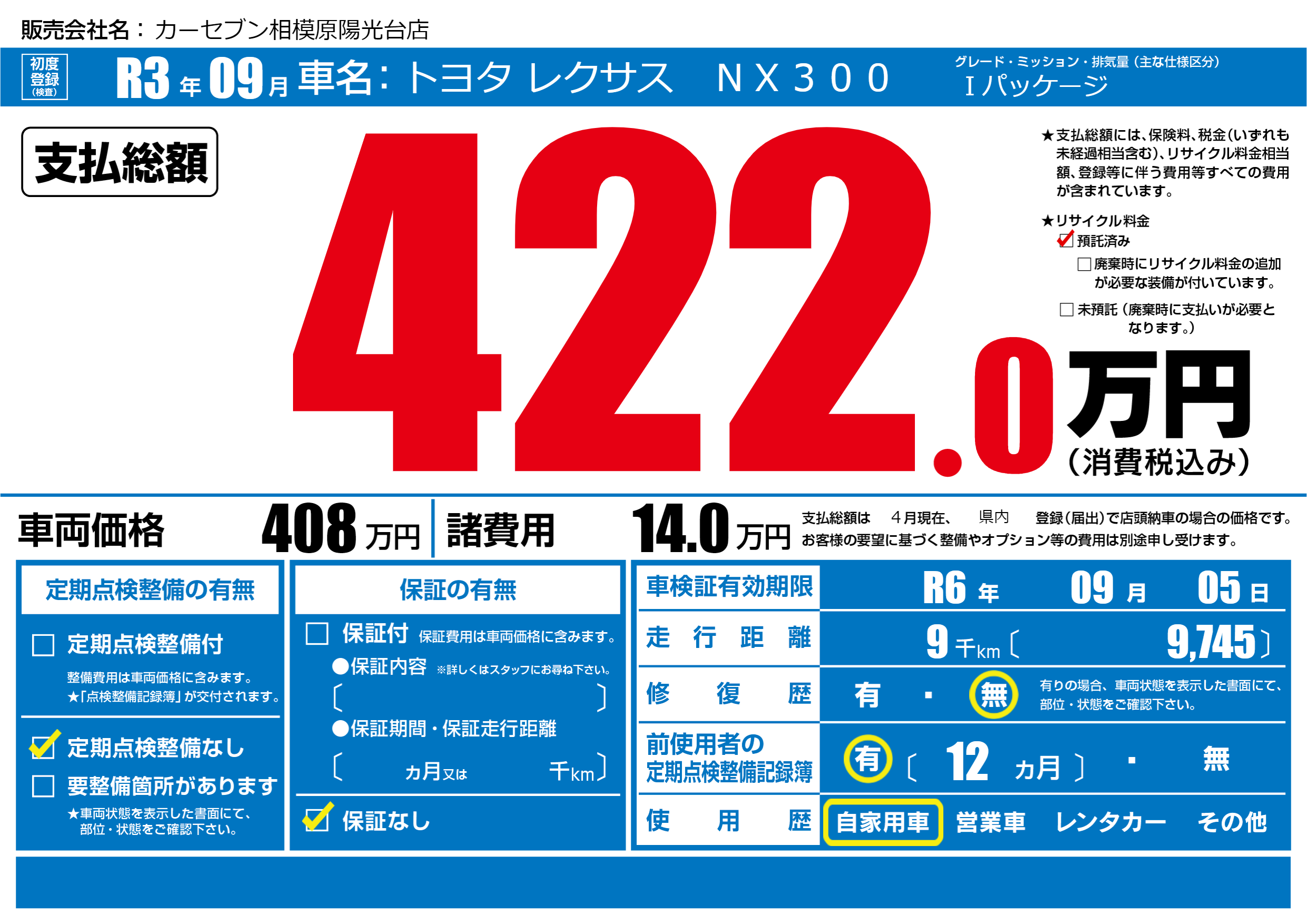 | 車名 | トヨタ レクサス NX300 | グレード ミッション 排気量 |