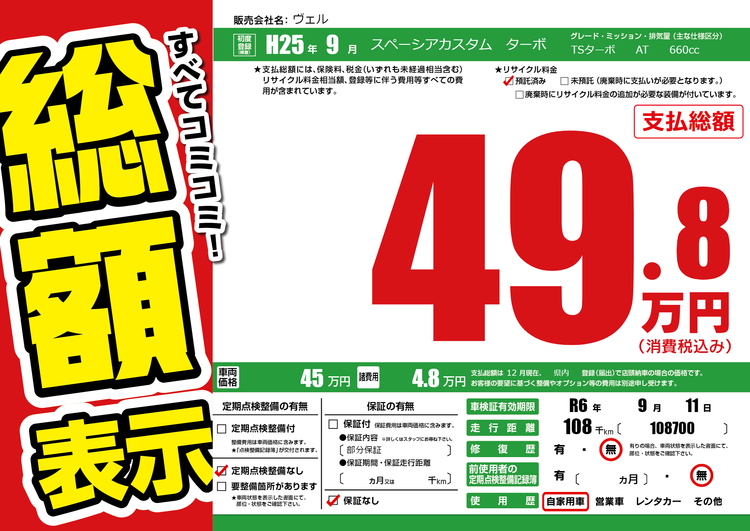| 車名 | スペーシアカスタム ターボ | グレード ミッション 排気量 |