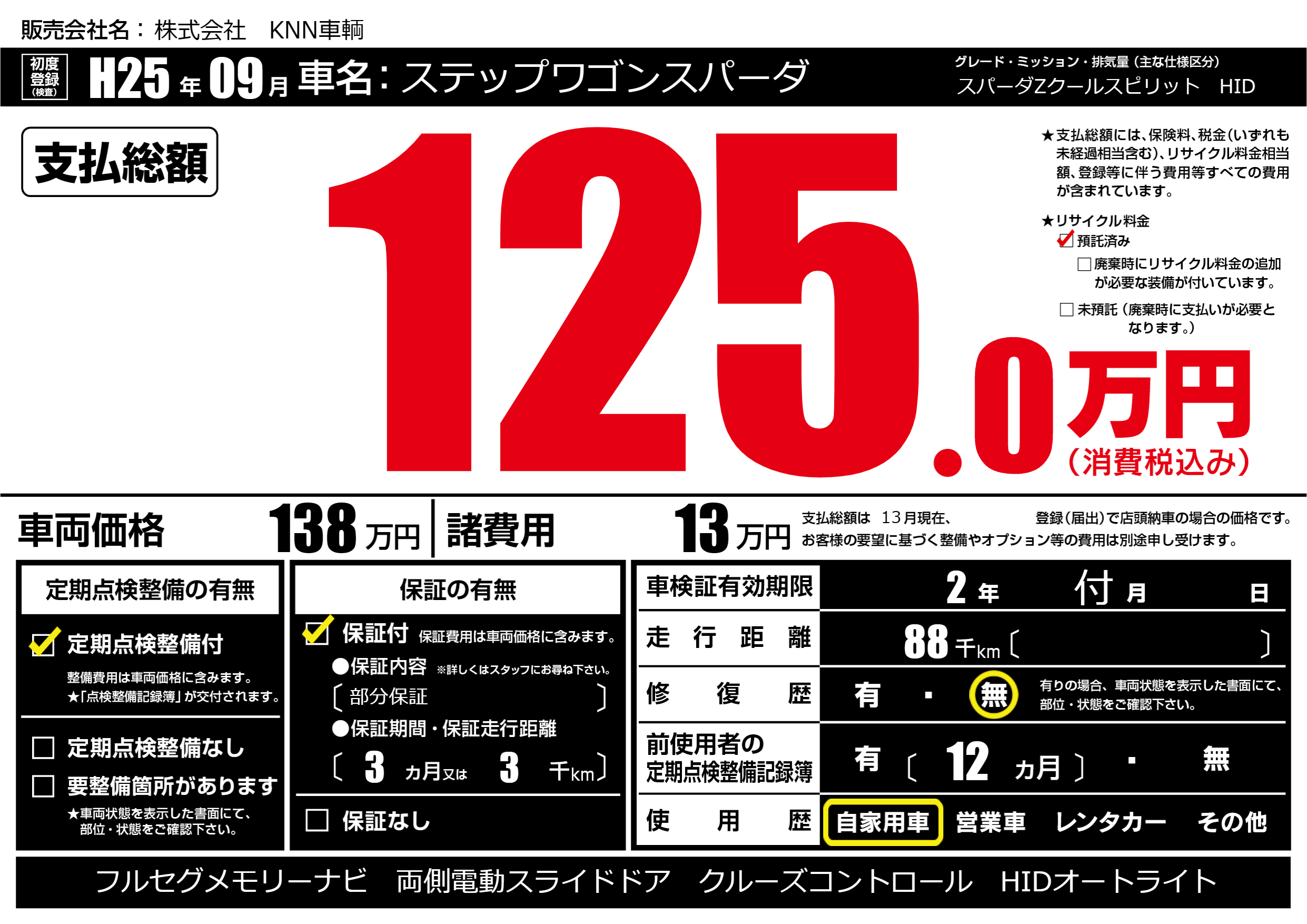 | 走行キロ | 8.8万km | 初年度登録 | H25年09月 |