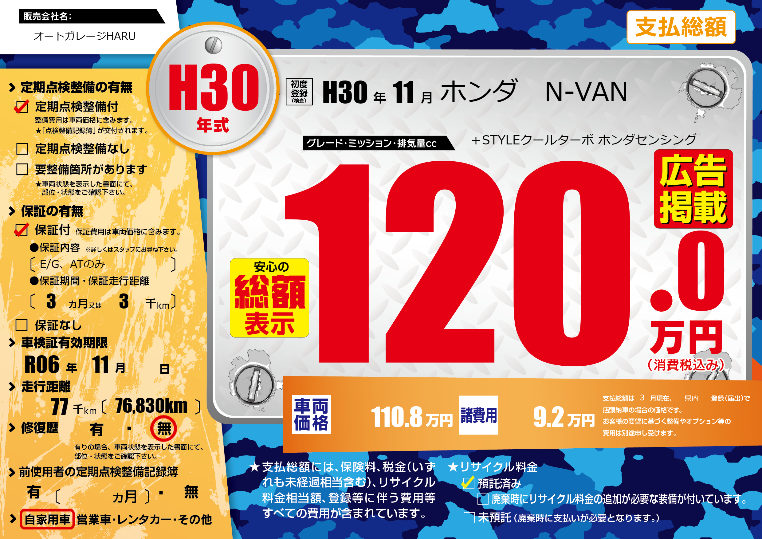 | 車名 | ホンダ N-VAN | グレード ミッション 排気量 |