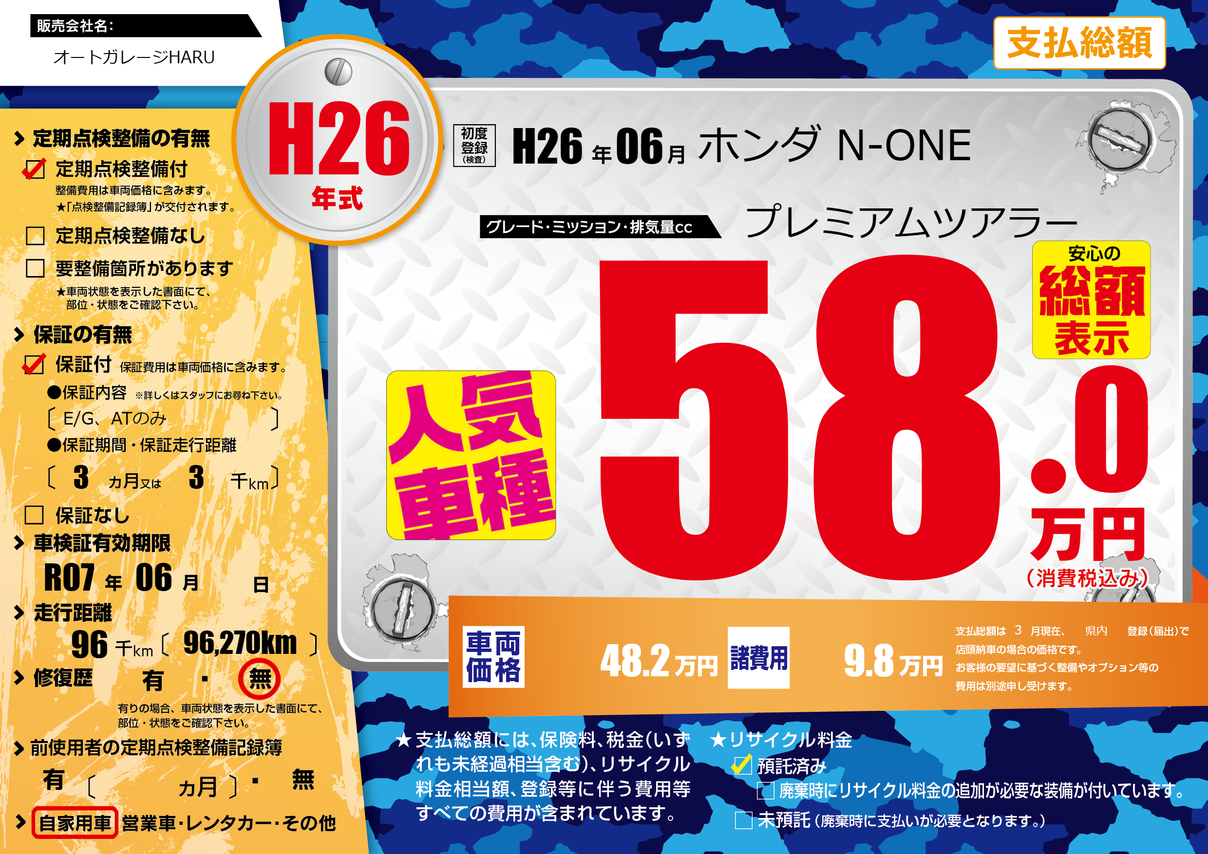 | 車名 | ホンダ N-ONE | グレード ミッション 排気量 |