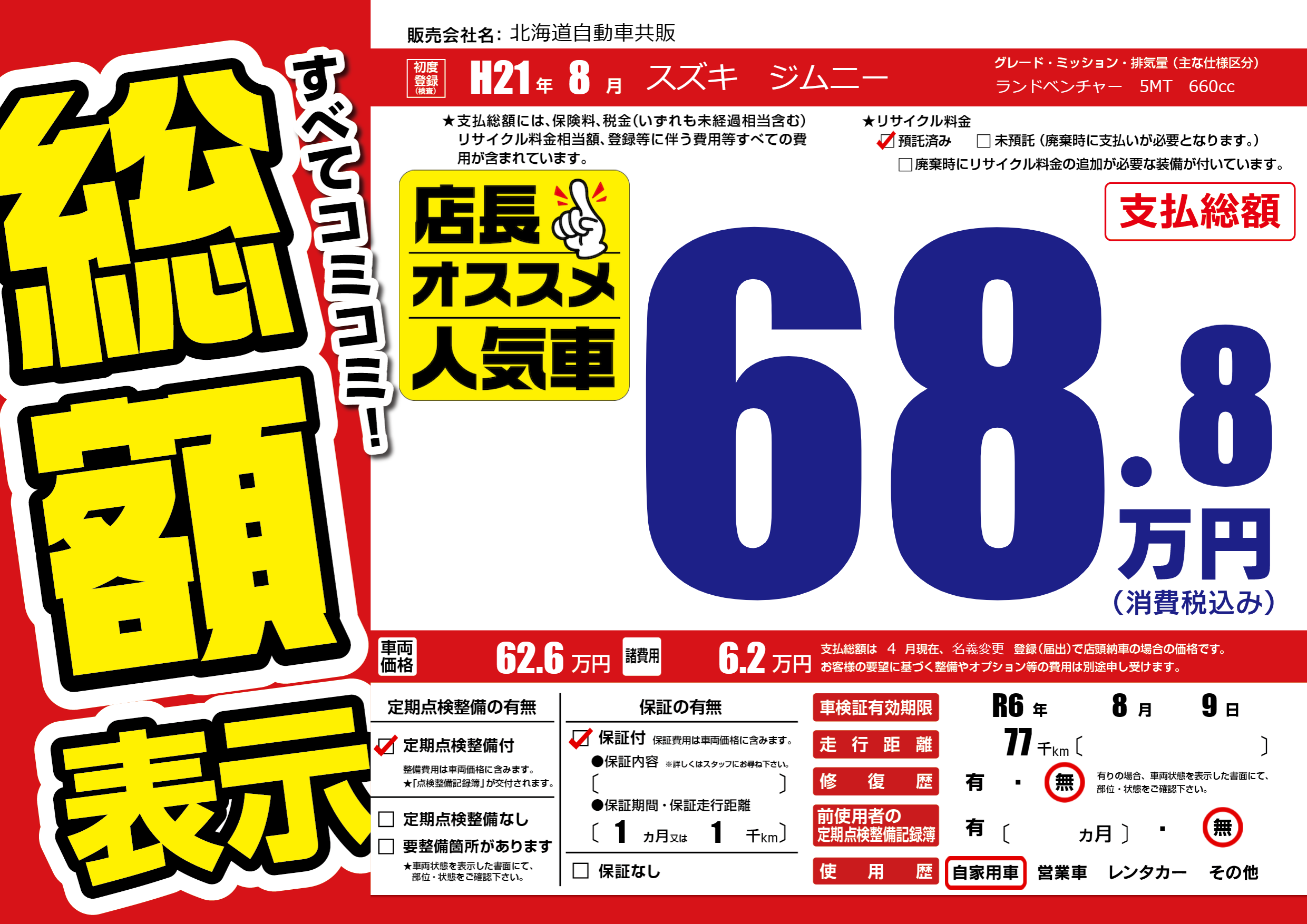 | 走行キロ | 7.7万km | 初年度登録 | H21年8月 |
