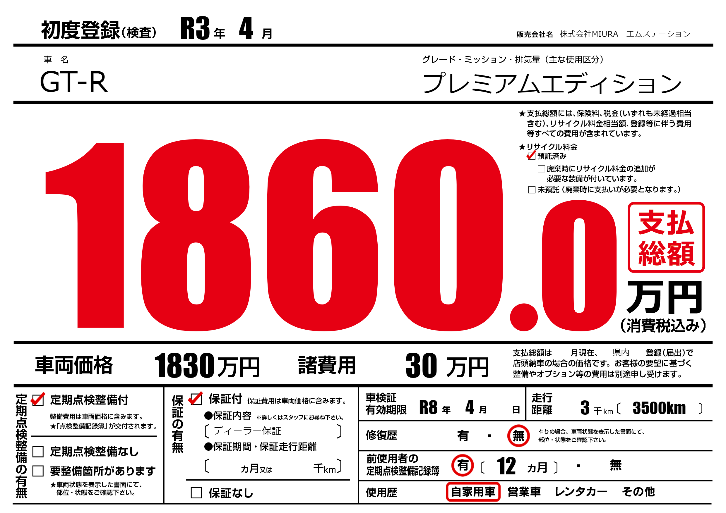 | 車検制限 | R8年 4月 - 日 | ||