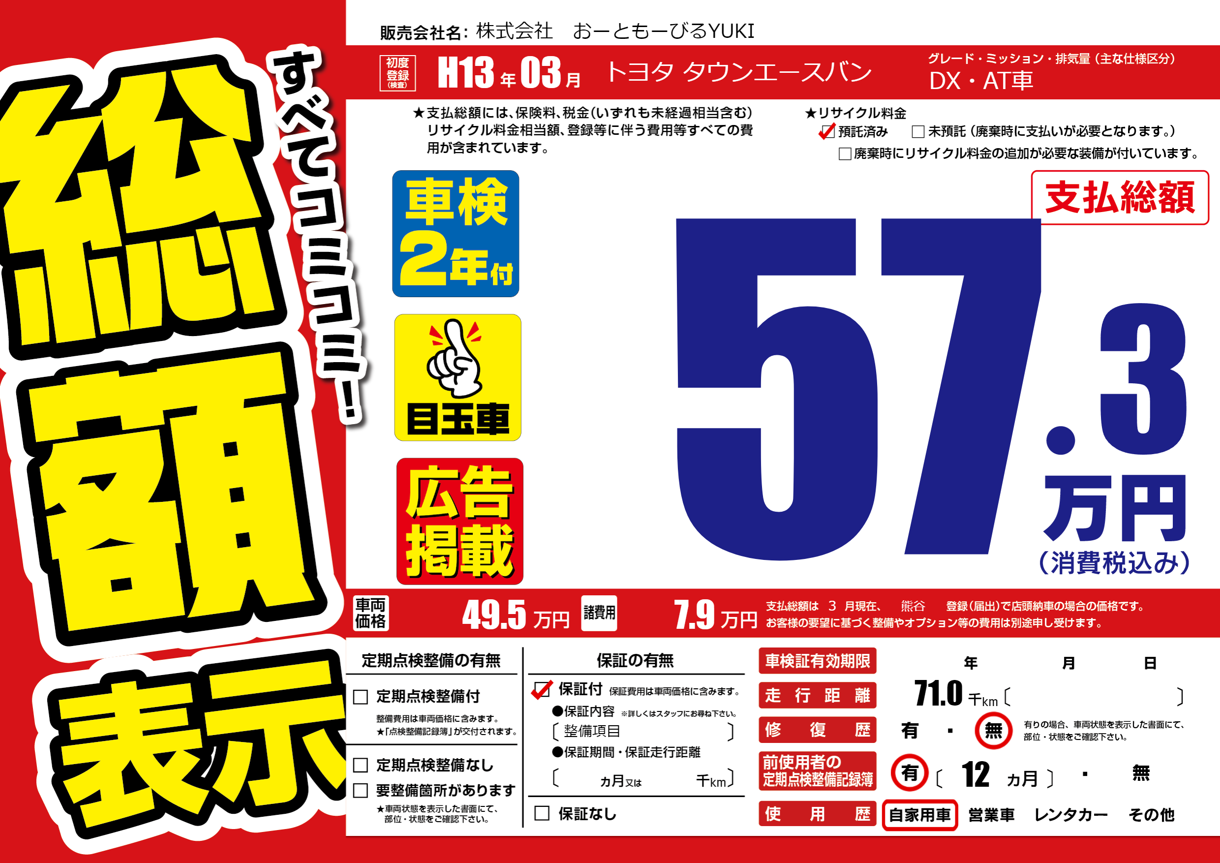 | 走行キロ | 7.1万km | 初年度登録 | H13年03月 |