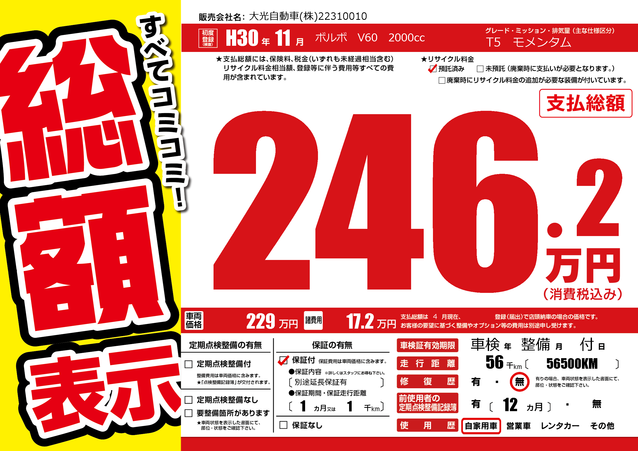 | 車名 | ボルボ V60 2000cc | グレード ミッション 排気量 |
