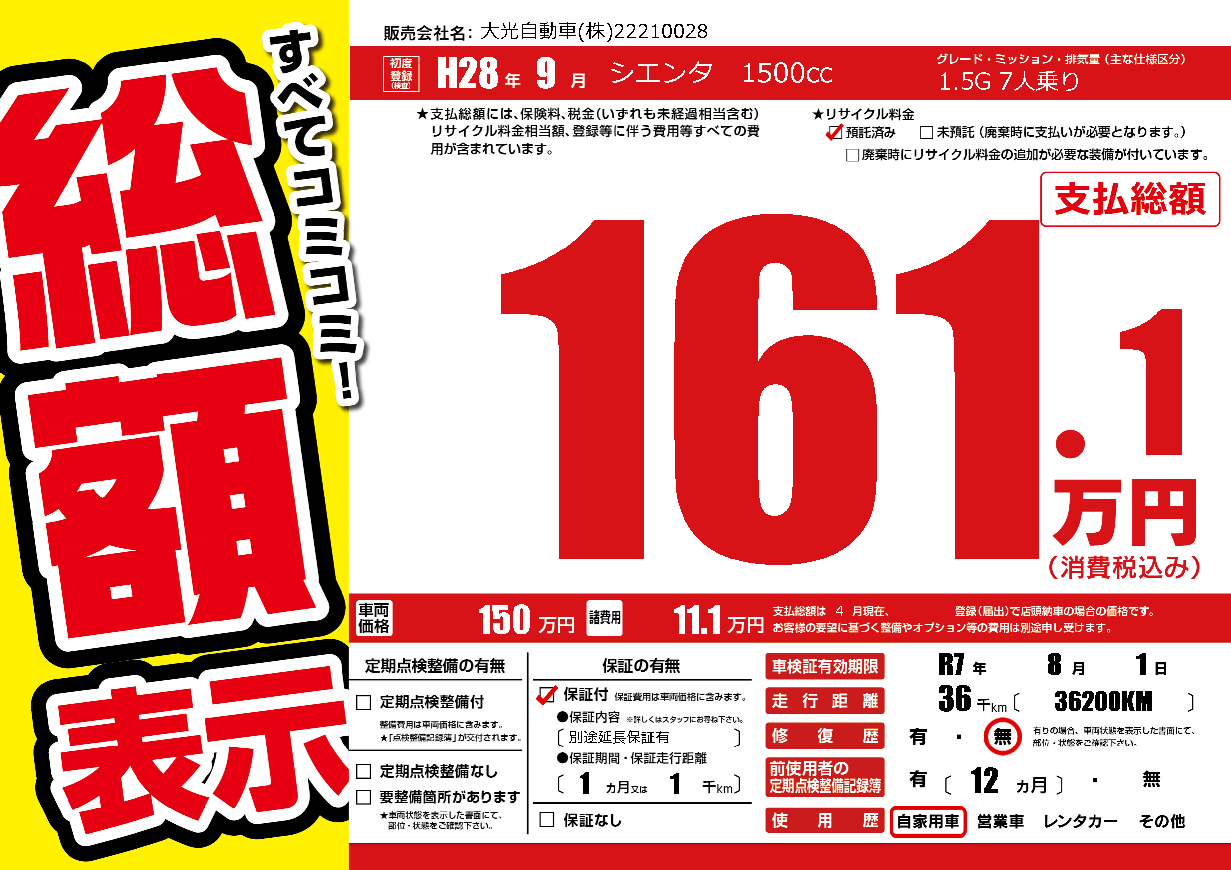 | 車名 | シエンタ 1500cc | グレード ミッション 排気量 |