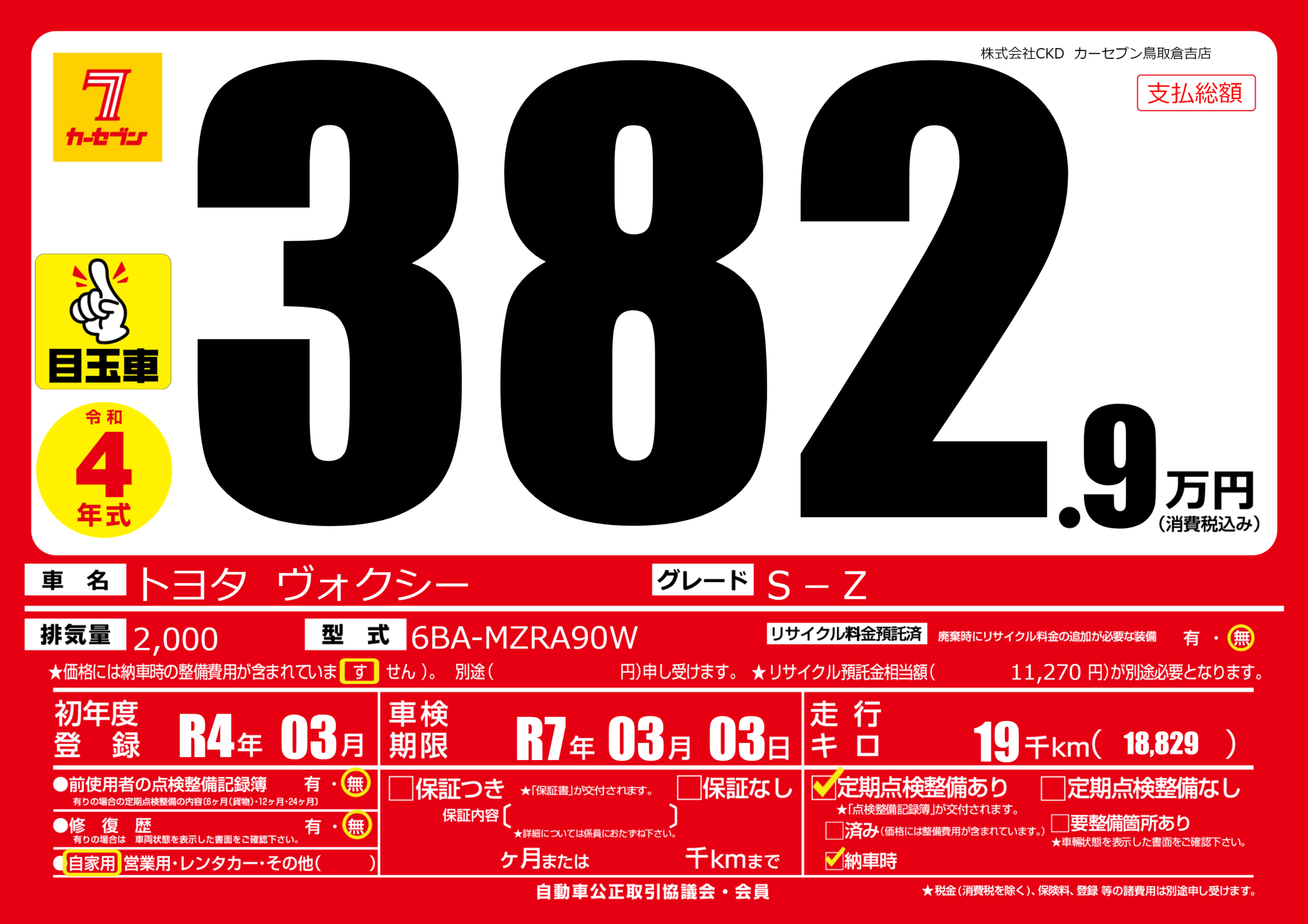 | 車名 | トヨタ ヴォクシー | グレード ミッション 排気量 |