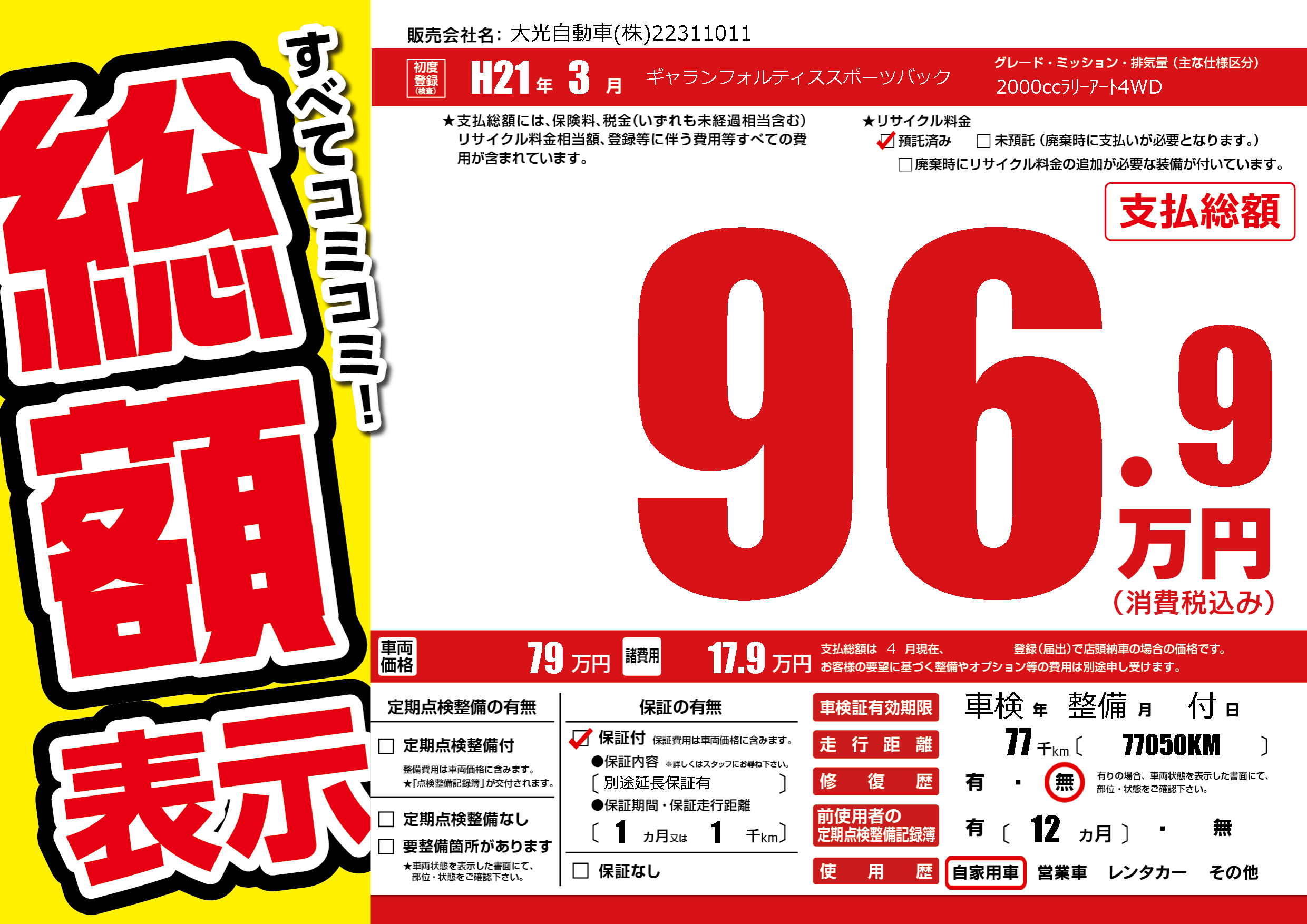 | 走行キロ | 7.7万km | 初年度登録 | H21年3月 |