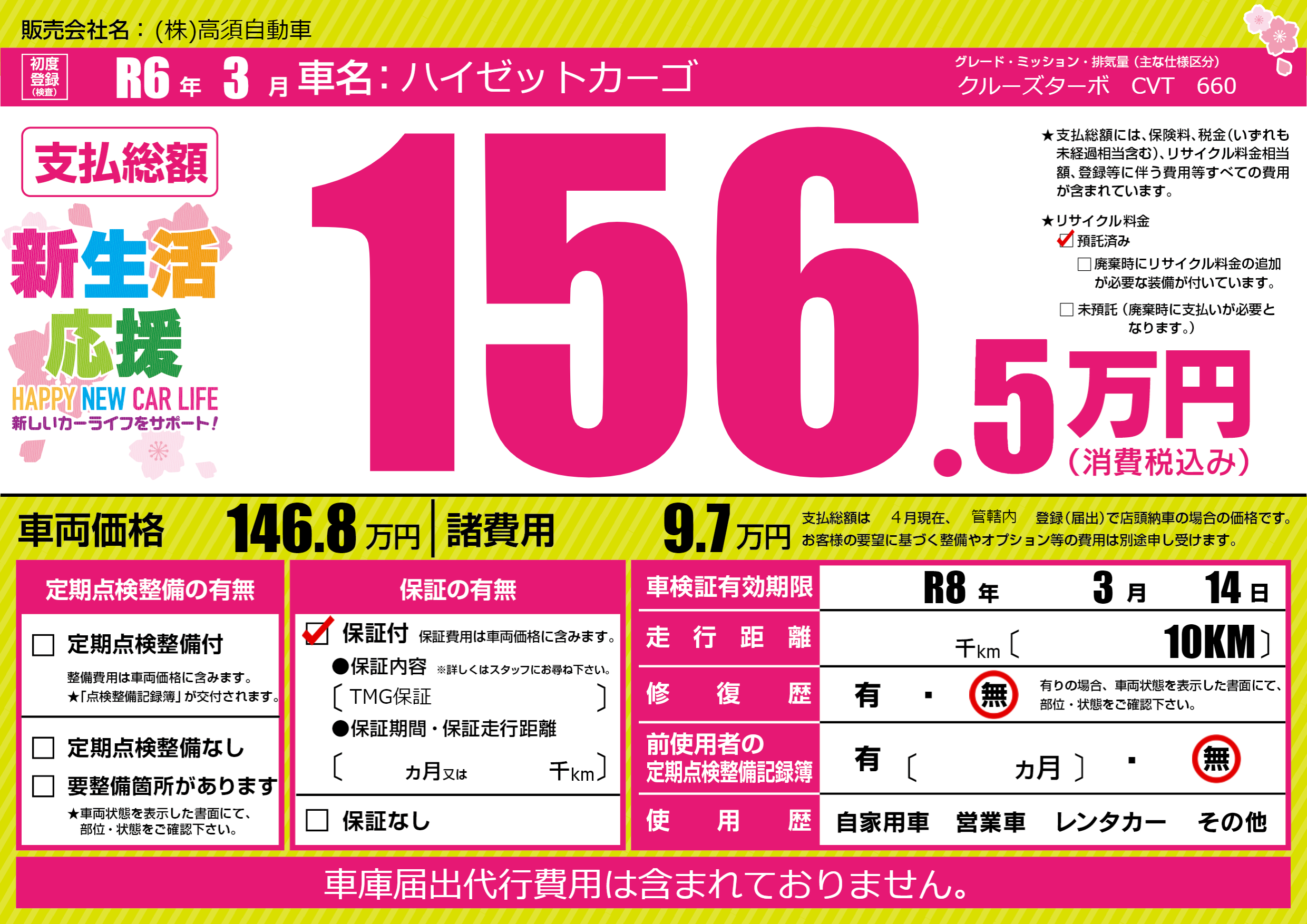 保証付き 保証内容(TMG保証) ---ヶ月または()千kmまで |