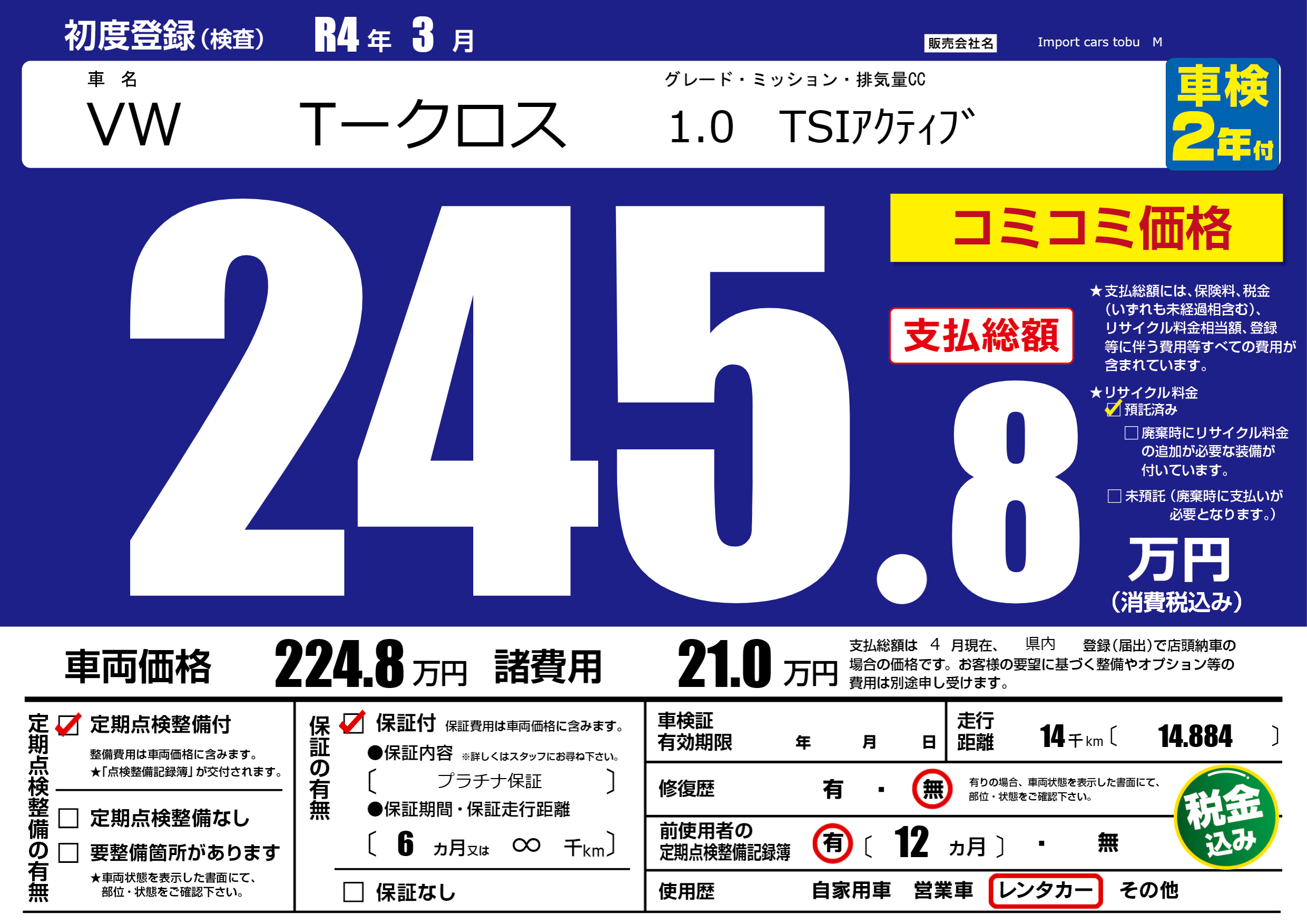 | 車名 | VW Tークロス | グレード ミッション 排気量 |