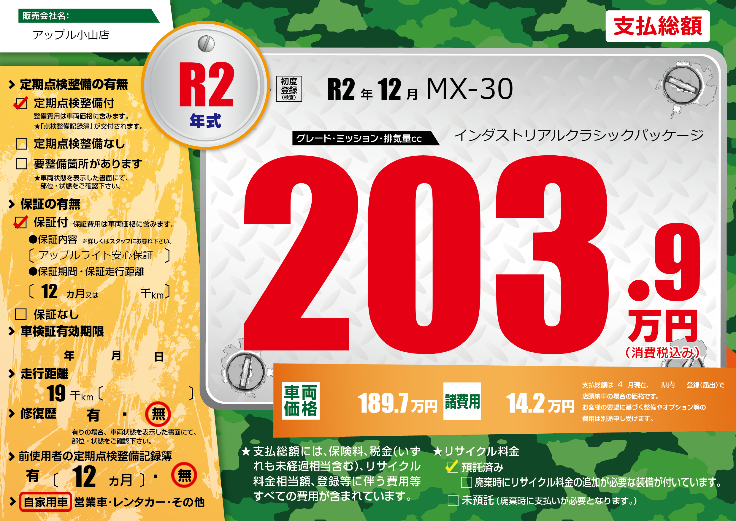 保証付き 保証内容(アップルライト安心保証) 12ヶ月または千km |