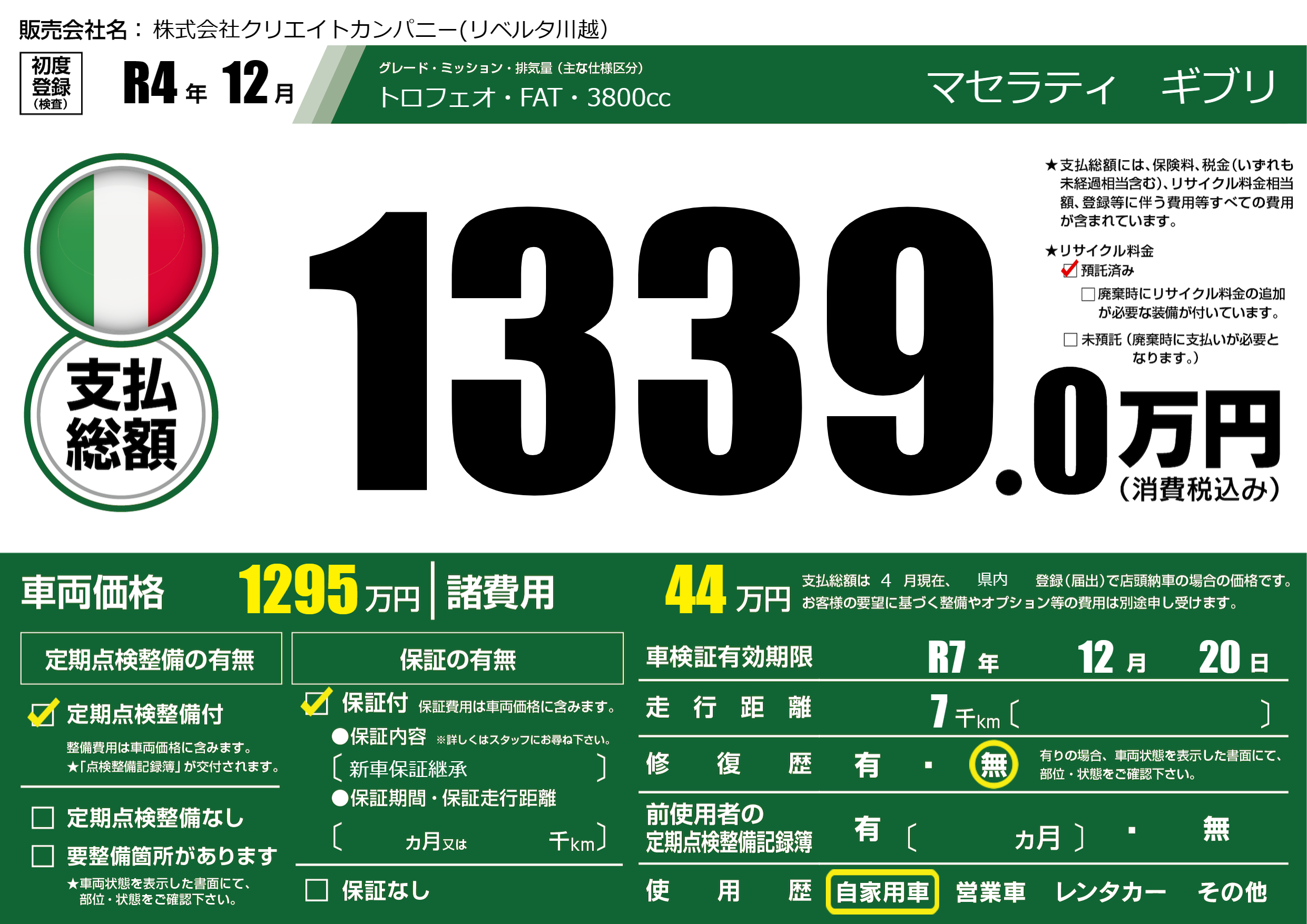 | 走行キロ | 0.7万km | 初年度登録 | R4年12月 |