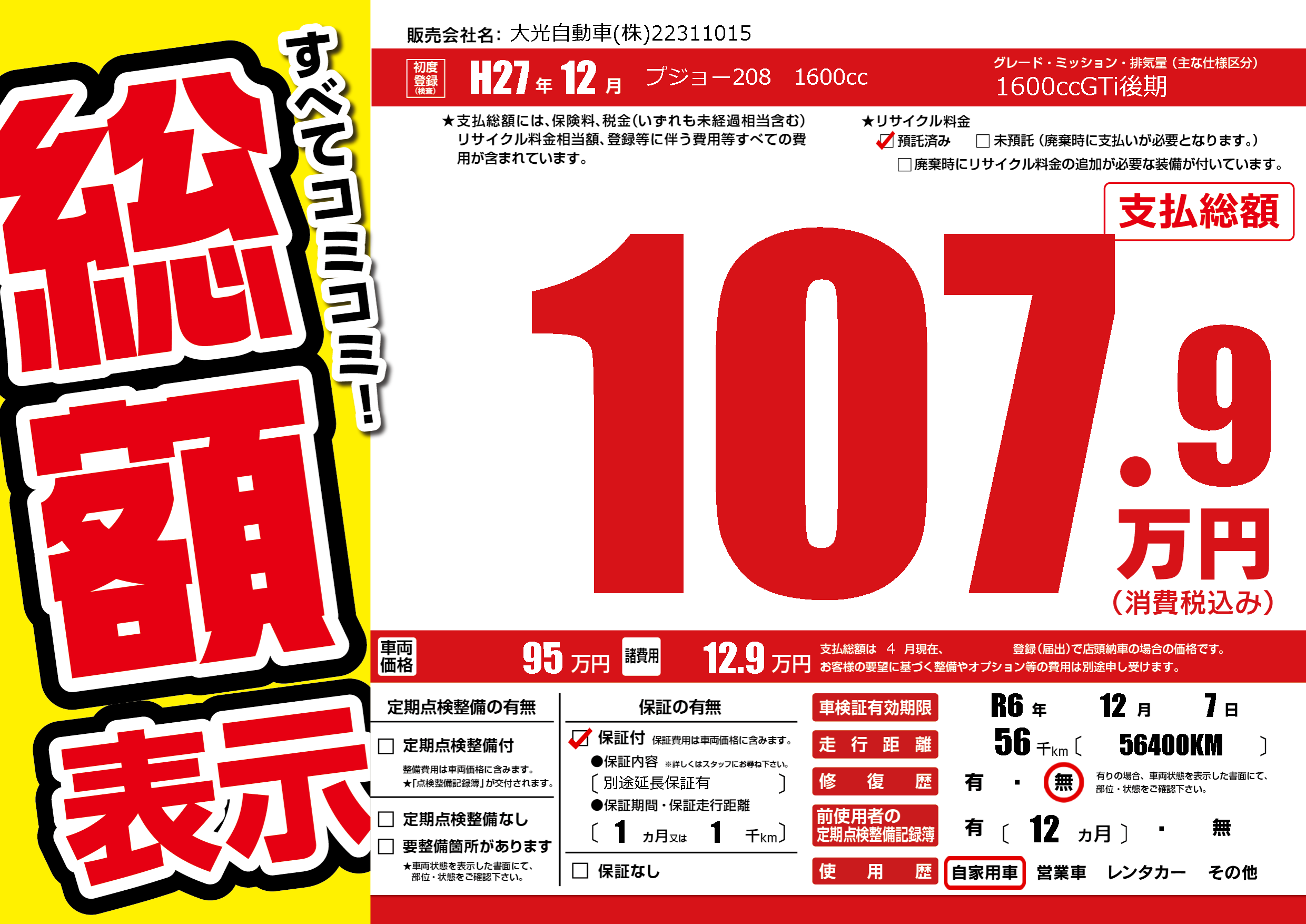 | 車名 | プジョー208 1600cc | グレード ミッション 排気量 |