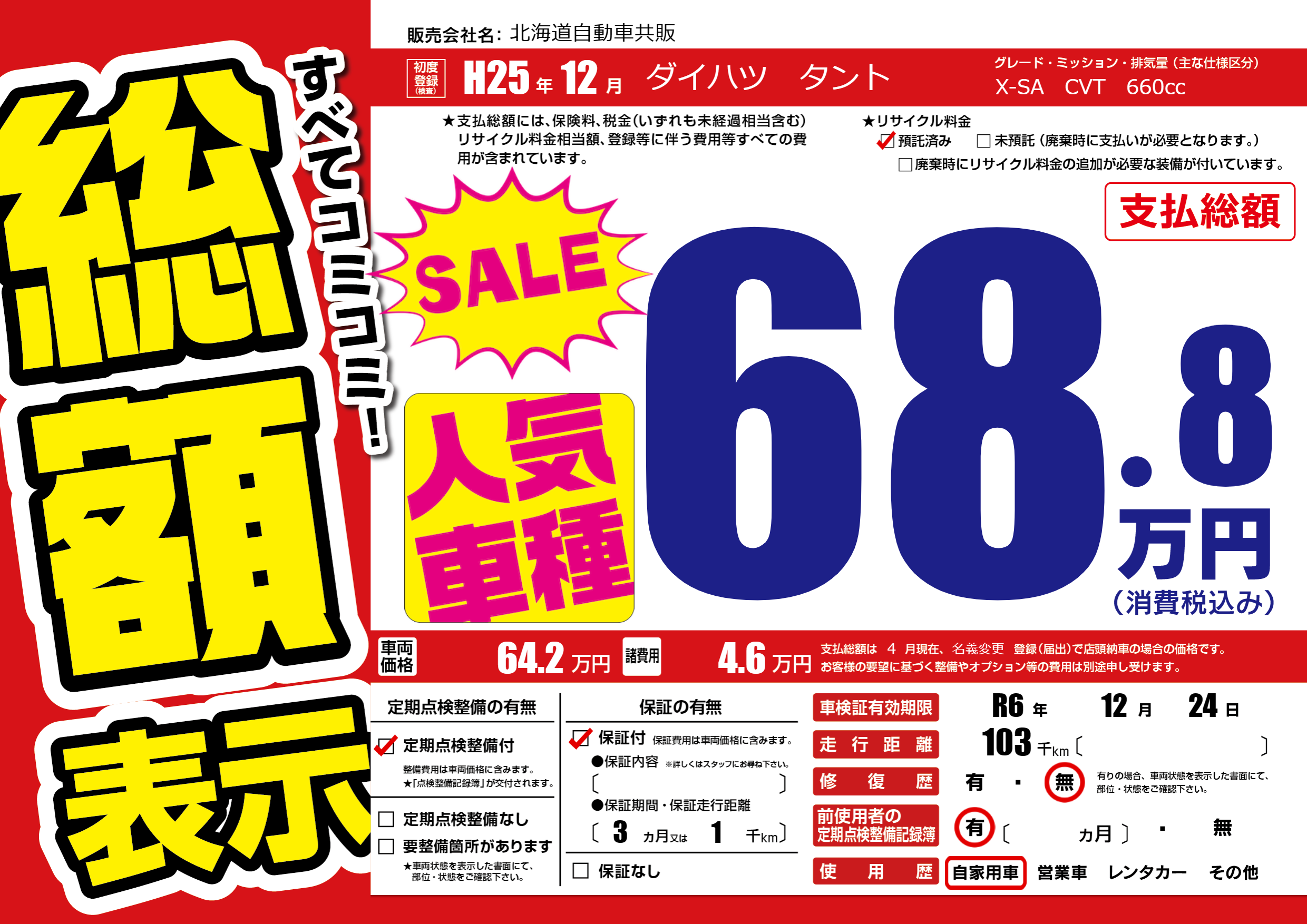 | 車名 | ダイハツ タント | グレード ミッション 排気量 |