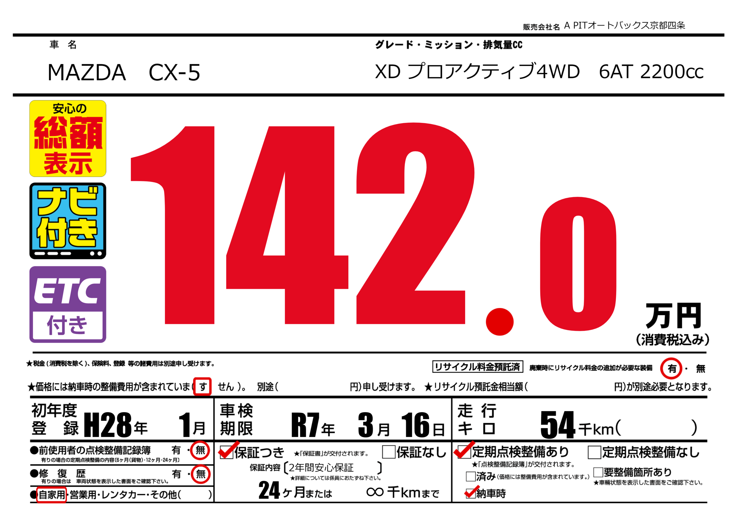 | 車名 | MAZDA CX-5 | グレード ミッション 排気量 |