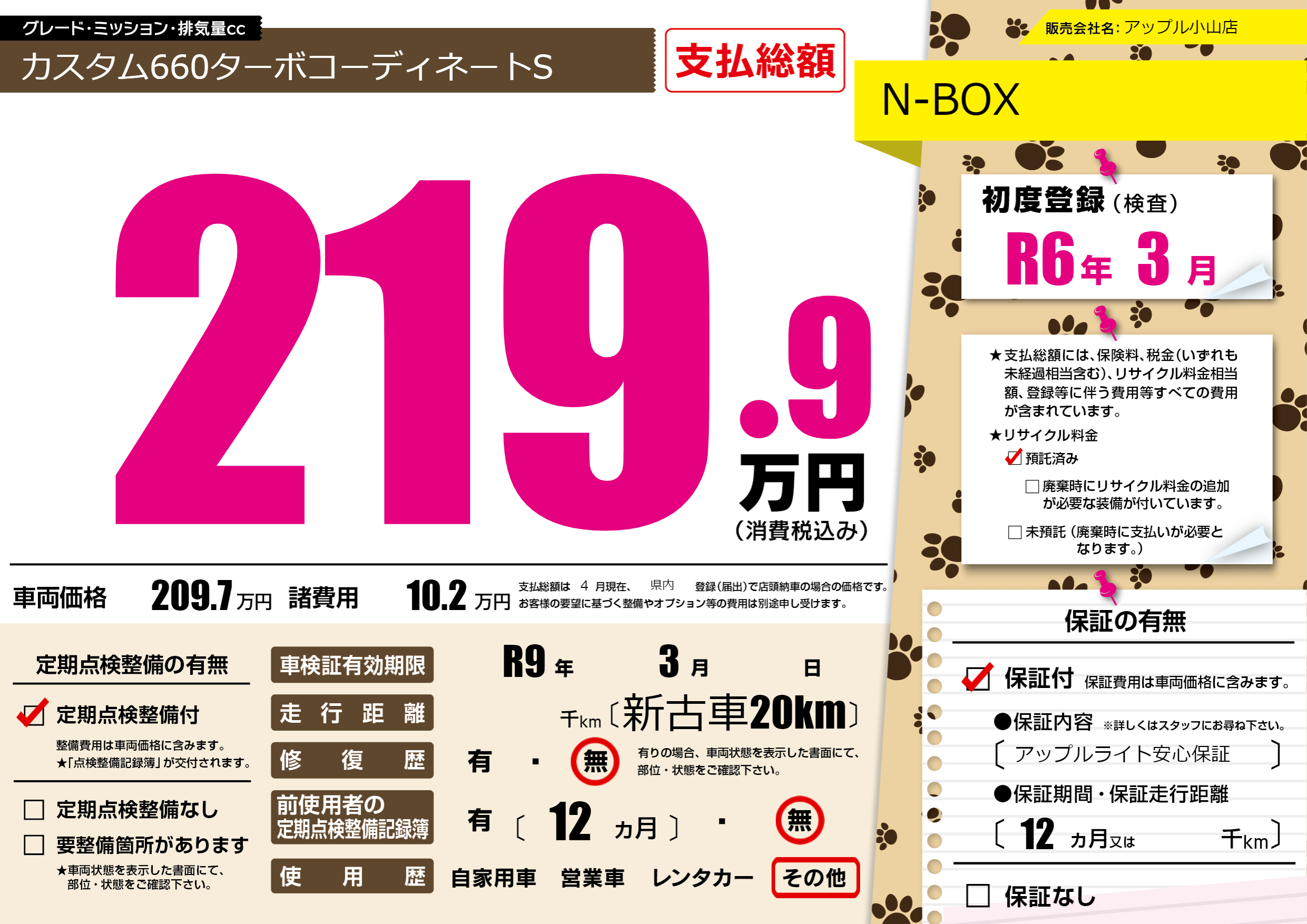 | 車名 | N-BOX | グレード ミッション 排気量 |
