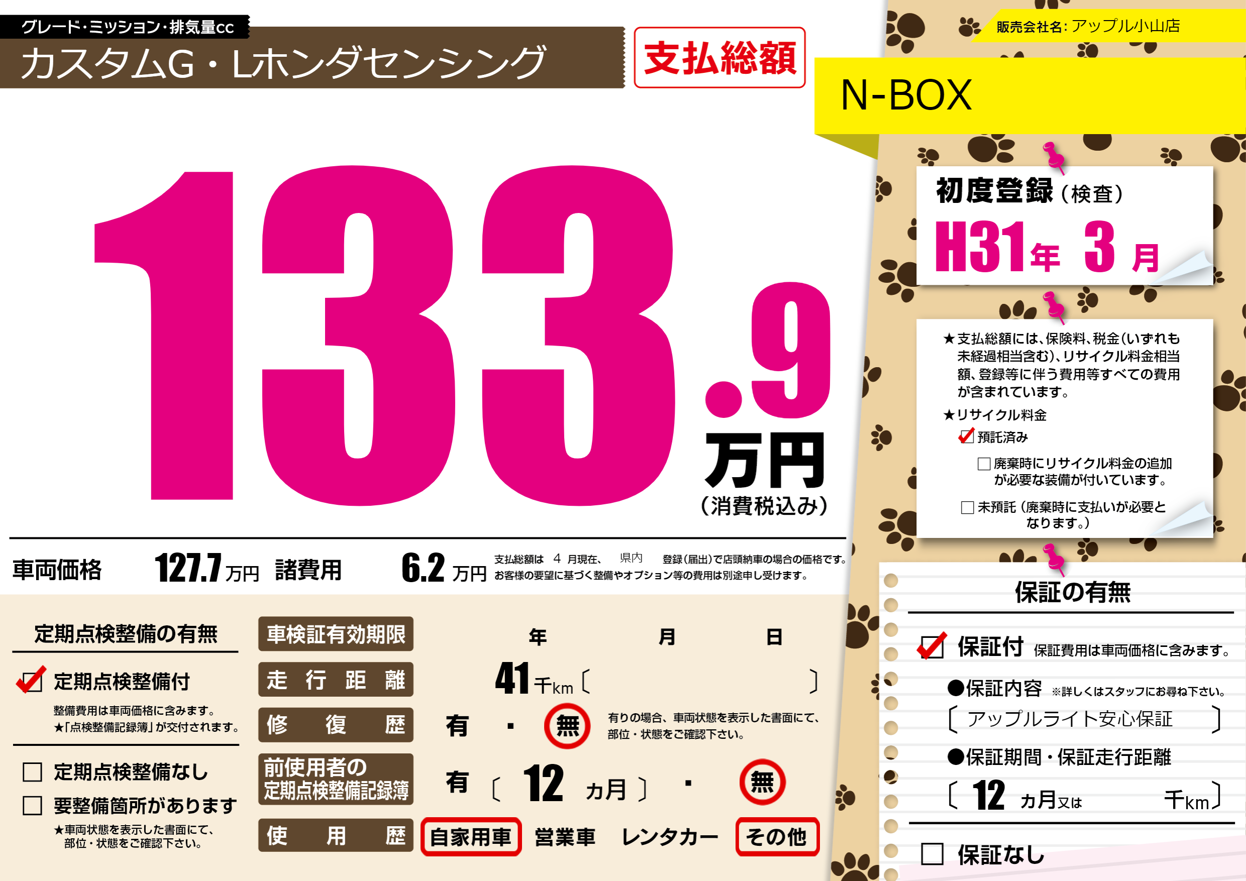 保証付き 保証内容(アップルライト安心保証) 12ヶ月または千km |