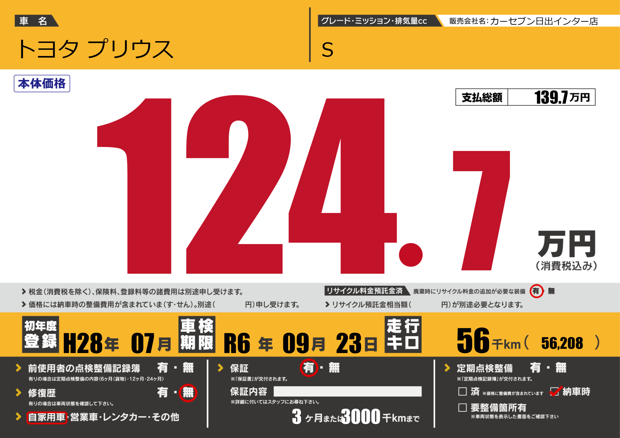 | 車名 | トヨタ プリウス | グレード ミッション 排気量 |
